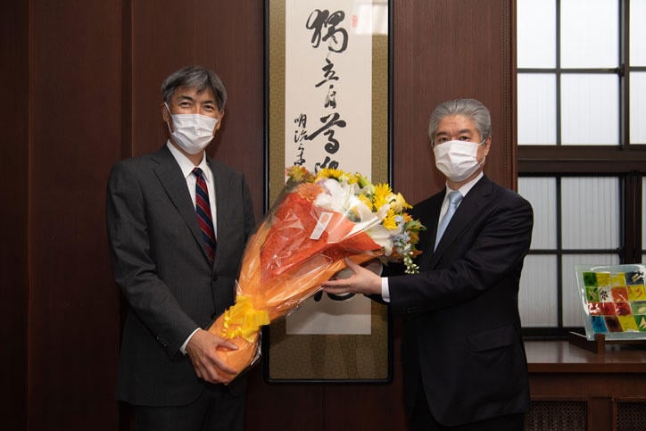 長谷山彰前塾長は、5月27日をもって4年の任期を終え、塾長を退任しました。5月27日に行われた評議員会終了後、三田キャンパス塾監局にて、感謝をこめて花束が贈られました。