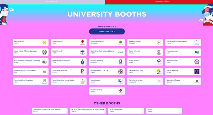 当日は、各大学や機関がそれぞれのバーチャルブースで、留学プログラムに関する説明会や、来場者とのグループ相談会などのセッションを行いました。セッションの参加総数は、延べ2,080人を超え、コロナ禍にあっても、日本留学に対する関心の高さがうかがえました。