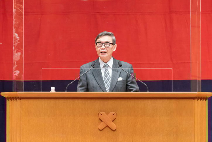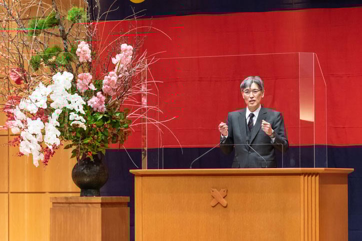 1月10日(月・祝)、「第187回福澤先生誕生記念会」が開催されました。慶應義塾では毎年1月10日に社中一同で創立者福澤諭吉先生の誕生日を祝っていますが、新型コロナウイルスの感染状況をふまえ参加者を学内関係者に限定して開催し、動画中継を行いました。