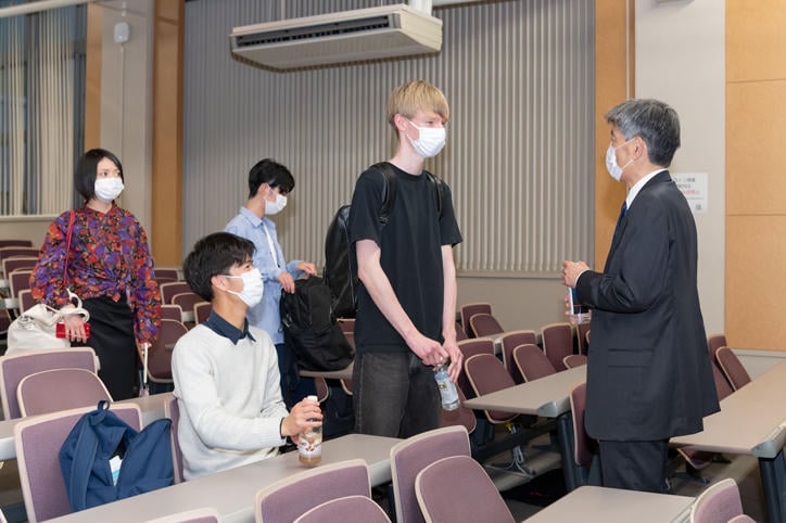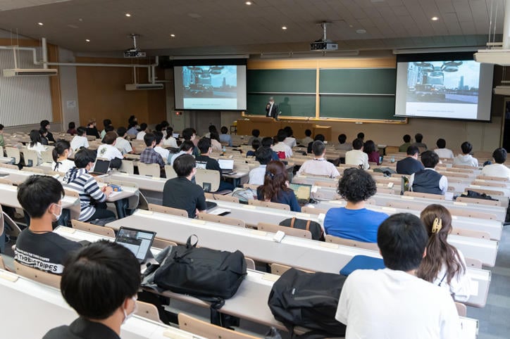 講演では、近未来に想定されるテクノロジーの進歩による世界観を案内しながら、今回の主要テーマである「情報」の価値について説明しました。国家・宗教の成り立ちにおける情報の重要性、今日のグローバルな世界で、規則(ルール)が作成される際の必要な情報の大切さを、学生が身近に感じられるニュースを取り上げながら、価値のある情報を取得する必要性について訴えました。最後に、現代社会に氾濫する情報に利用されるのではなく、自分自身で情報を取得する対価を払い、その情報を基に、正しい判断のできる人になってほしいと学生を激励しました。