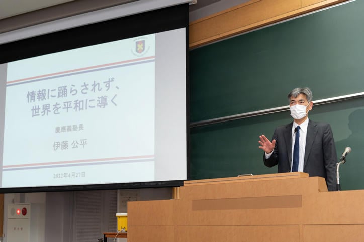 4月27日(水)、日吉キャンパスにて教養研究センター主催の「情報の光と影」をテーマにした講演シリーズ「情報の教養学」が開催され、伊藤公平塾長が登壇し、「情報に踊らされず、世界を平和に導く!」と題した講演を行いました。