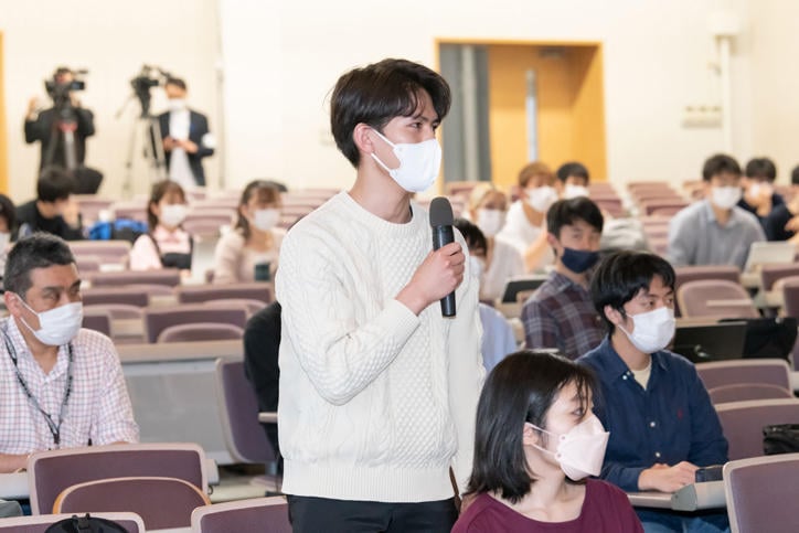 講演後の質疑応答では、SNSの影響、情報の取扱いルールなど、さまざまな情報に関係する質問が学生から寄せられ、活発なやり取りが行われ、伊藤公平塾長の回答に熱心にメモをとる姿も多く見られました。
