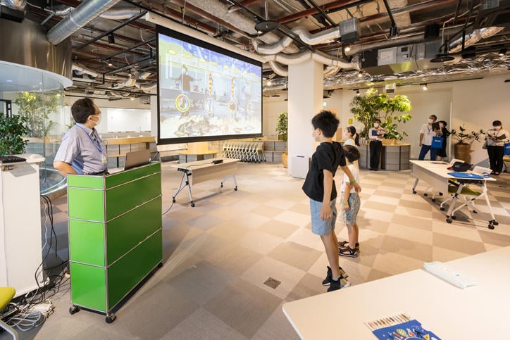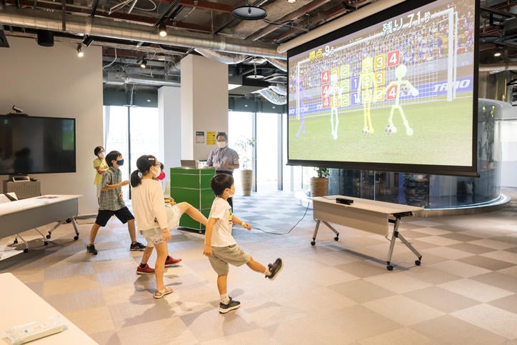 殿町タウンキャンパスは「魚つり、サッカーでプログラムを体感!」と題し、体を使ったさまざまなゲームを通してゲーム設計やプログラミング技術の可能性について体験できる企画を実施しました。今回のイベントでは、事前申し込み制、少人数のツアー形式にするなど大幅に規模を縮小し、感染防止対策を講じながらの開催となりましたが、参加した子どもたちは生き生きと楽しみながら参加していました。