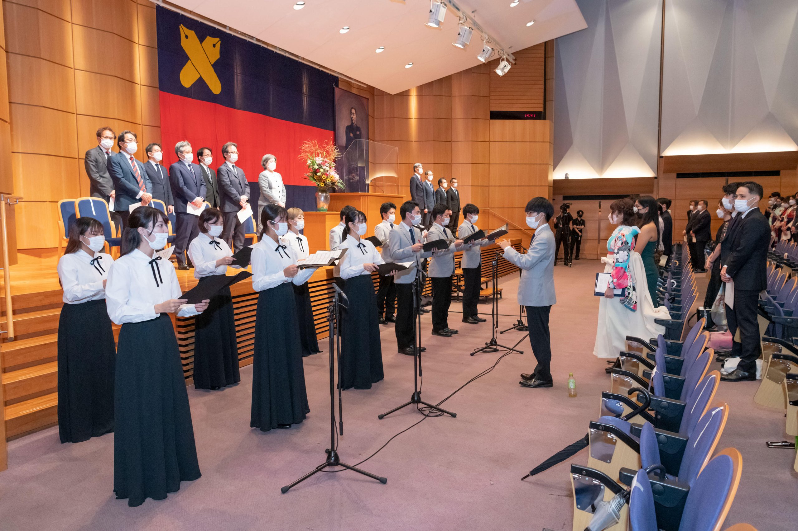 式は、松浦常任理事の学事報告に始まり、続いて伊藤塾長から各研究科修了生の代表に学位記が授与されました。英語による伊藤塾長の式辞では、昨今の社会情勢についてふれ、勉学の環境に制約が多い中、最後まで研究を成し遂げ、学位を取得したことをたたえました。研究の道を進む修了者には、学問のフロンティアを切り開くために、世界中の専門家と協力し、競い合いつつ、誰かが取り組まなくてはならないテーマにチャレンジすることを励ましました。終わりに、修了者の皆さんには、慶應義塾の精神を発揮し、30年後とその先に、より豊かで平和な生きがいのある世界を作っていくことを期待していると述べました。その後、矢作尚久政策・メディア研究科委員が教職員を代表して祝辞を述べ、続いて学生団体ワグネル・ソサィエティー男声合唱団、ワグネル・ソサィエティー女声合唱団による塾歌合唱で、式典は締めくくられました。