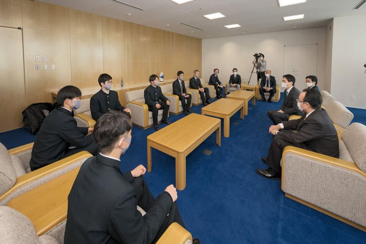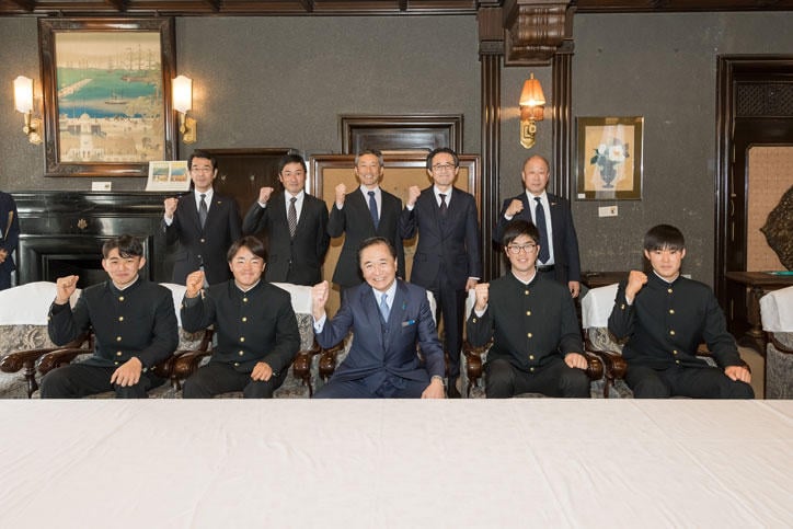 また28日(火)には、阿久澤校長と野球部員らは神奈川県庁、横浜市庁舎、毎日新聞横浜支局、神奈川新聞社、テレビ神奈川を表敬訪問しました。大村主将は、「神奈川県だけでなく、日本の代表として高校野球の新しい歴史を作り、たくさんの方々へ夢と希望をお届けしたい」と力強く語るとともに地元の皆さまへの恩返しを誓いました。黒岩祐治知事は甲子園での声出し応援ができるようになったことに触れ、「大きな舞台でたくさんの声援を力に練習の成果を発揮し、ぜひ優勝旗を神奈川県へ持ち帰ってほしい」と激励しました。