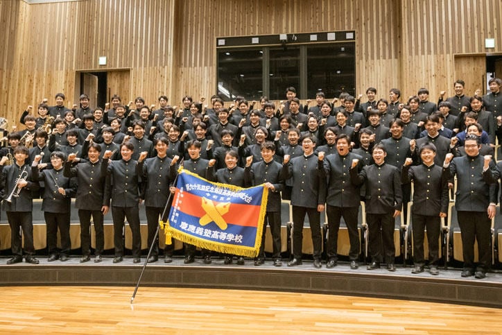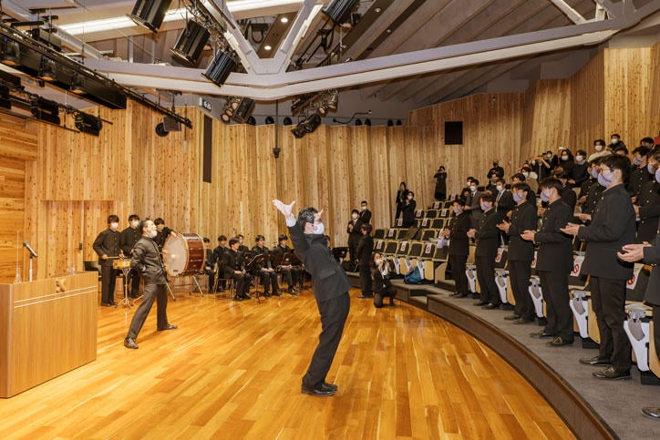 2月24日(金)に高等学校敷地内の日吉協育ホールにて選抜旗受領式が行われ、日吉の街の関係者の皆さまが見守る中、本大会主催者である毎日新聞社の田中成之横浜支局長から阿久澤武史校長へ選抜旗が授与されました。阿久澤校長は「異端と見られても正しいと信じる道を進み、大いに活躍してほしい」と野球部員を激励し、森林監督と大村主将が感謝と決意を語りました。その後に行われた壮行会では應援指導部によるエールで大いに盛り上がりました。