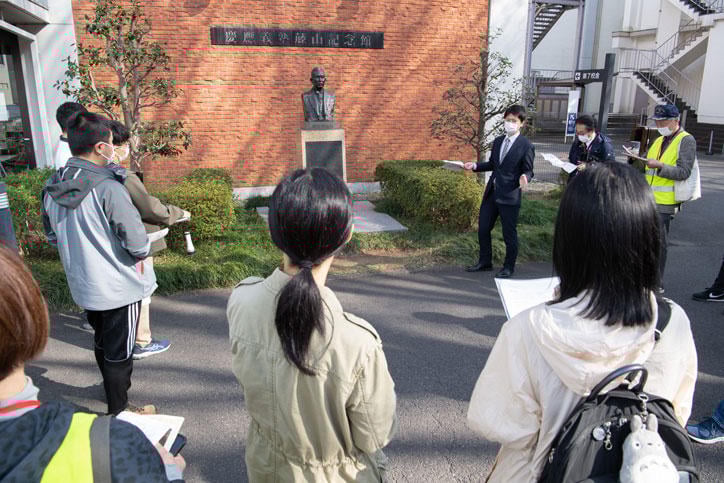 福澤諭吉、慶應義塾ゆかりのスポットを巡りながら、知られざる歴史や大切に受け継がれている気風を知るこのツアー。これまでは福澤諭吉が生まれた大阪、子ども時代を過ごした中津(大分県)など全国各地を訪れていましたが、昨年は感染症対策の観点から三田キャンパスをめぐりました。そして今年は、大勢の1・2年生が学び数多くの学生団体の活動拠点でもある日吉キャンパスと、大学病院がある信濃町キャンパスを舞台に開催されました。