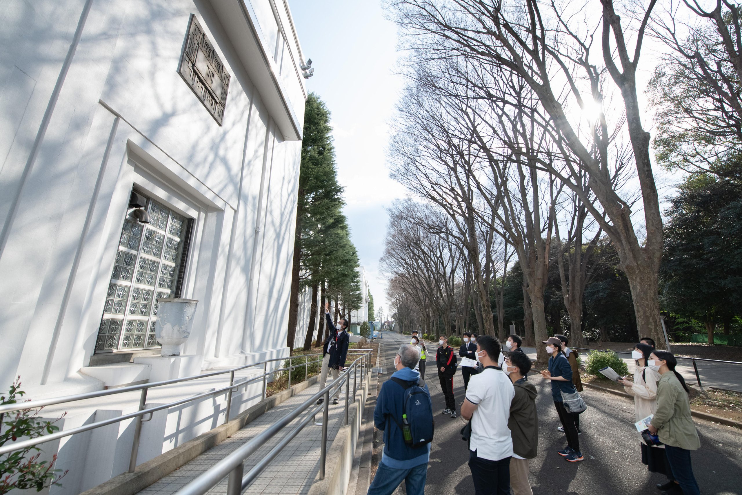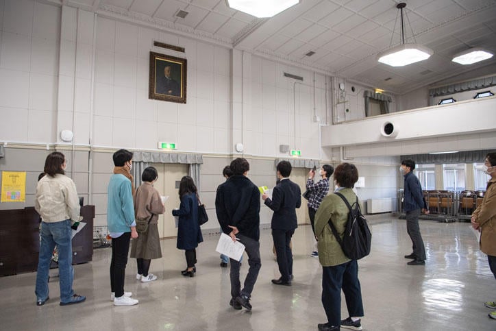 また3月10日(金)には、都倉准教授と阿久澤武史慶應義塾高等学校長による案内のもと、日吉キャンパスのツアーが実施されました。日吉図書館(日吉メディアセンター)前の福澤諭吉像をはじめとするよく知られたスポットはもちろん、普段は立ち入ることのできない場所も回りながら、慶應義塾を語る上では欠かせない人物やできごとについて理解を深めました。この日は、日吉台地下壕保存の会にもご協力をいただき、日吉キャンパスに現存する戦時中に作られた地下壕も見学しました。写真、音声など豊富な資料をもとにした説明に加えて、実際に使われていた地下壕を体感することで、戦時下の生活、学びのあり方について考えさせられる機会となりました。