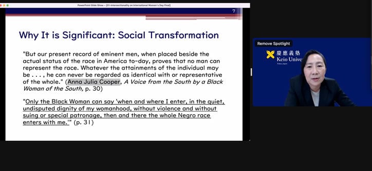 本イベントで奥田理事は、インターセクショナリティ(Intersectionality)というコンセプトの成り立ちや重要性ついて、プレゼンテーションを行いました。プレゼンテーションの様子はこちらからごらんいただけます。