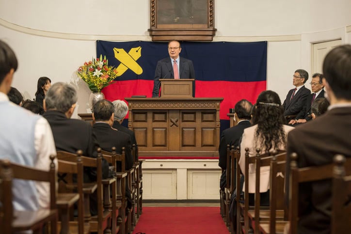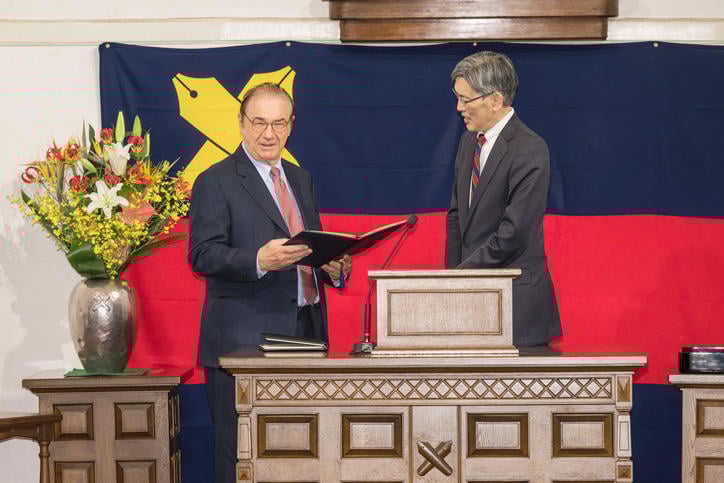 授与式では、ワグネル・ソサィエティー男声合唱団による塾歌が響くなか、ティース氏らが入場し、王英燕商学研究科教授の司会のもと、横田絵理商学研究科委員長が推薦文を朗読しました。続いて、伊藤公平塾長が名誉学位記を授与して式辞を述べ、それに応えてティース氏からの謝辞がありました。