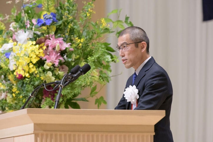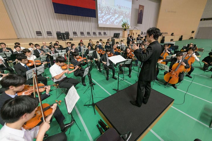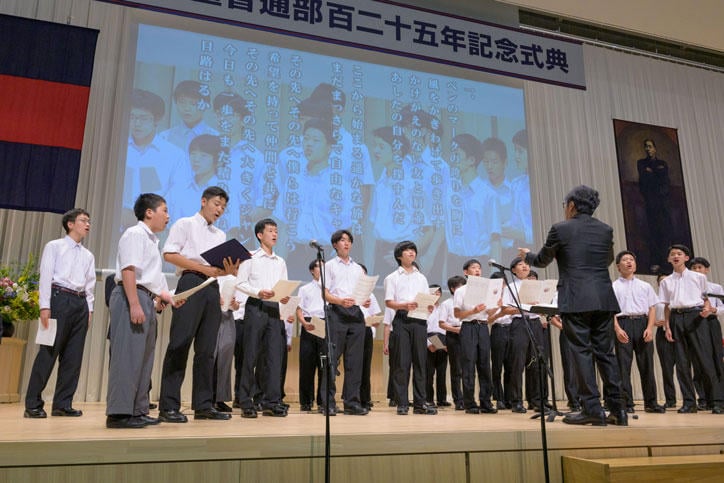 式典は塾歌斉唱に始まり、森上和哲普通部長による式辞、伊藤公平塾長からの祝辞の後、在校生が制作した普通部紹介ビデオが上映されました。その後も来賓の方々から祝辞をいただきました。式典後半では作曲家の千住明君(1976年普通部卒)が作曲・編曲、作詞家の澤地隆君(1977年普通部卒)が作詞を担当した百二十五年記念歌「その先へ」の合唱が、在校生・卒業生合同オーケストラの演奏により行われました。社会で活躍する卒業生の言葉、普通部生代表の言葉が続き、普通部の歌を斉唱して約1時間半の式典は閉式となりました。