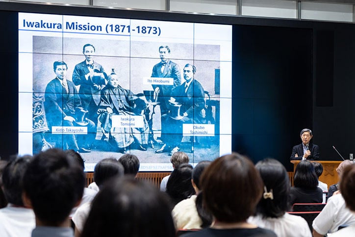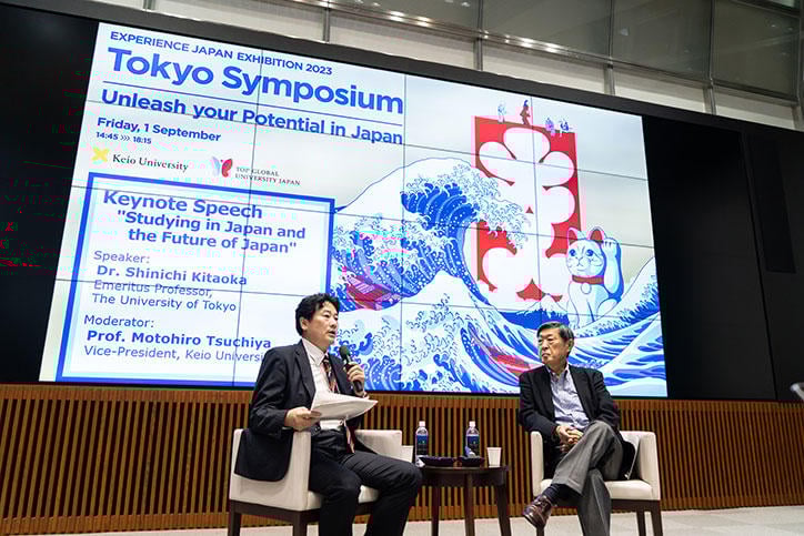 まず、シンポジウムのはじめに、東京大学名誉教授の北岡伸一氏による"Studying in Japan and the Future of Japan"と題する基調講演が行われ、続いて、土屋大洋慶應義塾常任理事をモデレーターとして会場参加者との質疑応答が交わされました。