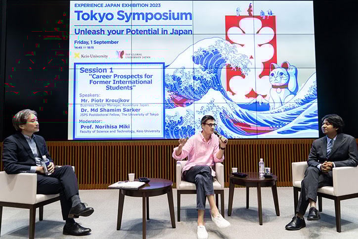 次に、三木則尚慶應義塾大学理工学部教授のリードで、現在日本国内でビジネス界やアカデミアでキャリアを築いている元留学生2名が、日本留学のメリットや直面した課題、その後のキャリア形成について実体験を披露しました。
