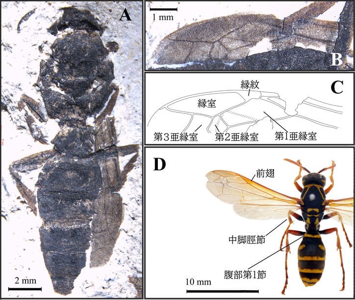 この化石は体長およそ18 mmと大型で、前翅に亜縁室が三つあること、中脚脛節に棘が二つあること、翅を折りたためることなどの特徴からスズメバチ科(Vespidae)に属します。さらに腹部第 1節が長い柄状ではなく、短いつり鐘状の形態からアシナガバチ亜科(Polistinae)のアシナガバチ属の化石Polistessp.と同定されました。