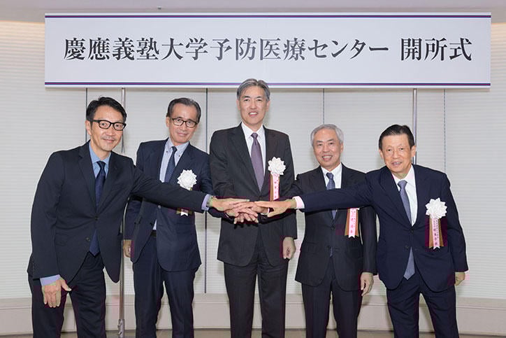 慶應義塾大学医学部、大学病院は初代医学部長で病院長の北里柴三郎の時代より予防医療を原点としてきました。伊藤公平塾長はその伝統に触れながら、このたびの移転プロジェクトに尽力されてきた先人たちの想いを引継ぎ、慶應義塾として、理想とする予防医療確立のため課題解決に向けて全力で取り組んでいくと挨拶しました。北川雄光常任理事は、慶應義塾がそれぞれの時代や分野で果敢に新しいことにチャレンジすることを使命としてきたことを語りました。その上で、未来型予防医療を目指し、病院を出て街に出るという決断をした予防医療センターの大きな挑戦を支えた森ビルや大学病院の関係者に謝辞を述べました。