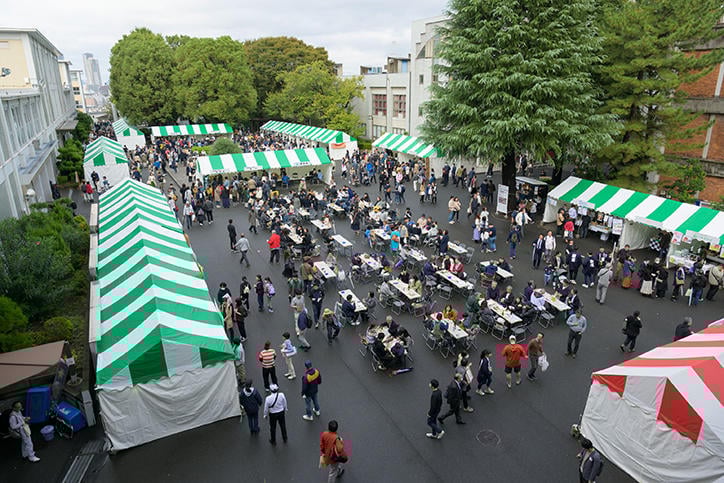 このほか、塾長トークイベント「リアルで会うということ」~ポストコロナの気品の泉源~と題して、池上彰氏、山口周氏、伊藤塾長による鼎談や、チアリーディング キッズ体験教室などのイベントも用意され、幅広い年代の方が楽しめるプログラムがキャンパス内の各会場で開催されました。多くの模擬店の出店もあり、雨が上がった後の記念館前や中庭では食事を楽しむ姿も多くみられました。最後には、グランドフィナーレとして、豪華賞品が当たる福引抽選会や応援歌ステージが行われ、久しぶりの再会を喜びあう一日となりました。