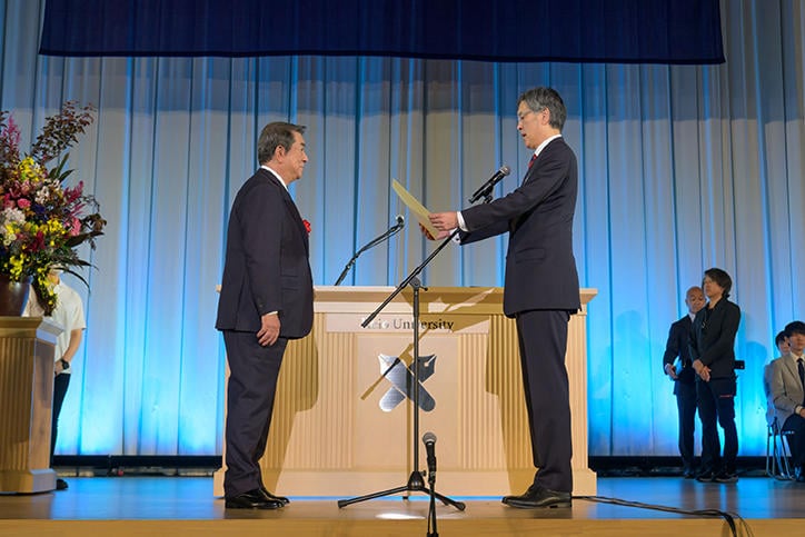 10時から日吉記念館で行われた記念式典では、森吉平大会実行委員長による開会宣言の後、塾旗登壇、塾歌斉唱があり、菅沼安嬉子慶應連合三田会会長からの挨拶では、会長のバトンを麻生泰氏(慶應義塾評議員)に渡したことも語られました。伊藤公平塾長の祝辞と続き、慶應義塾から長年の貢献に対して、卒業生の加山雄三さんに感謝状が贈られました。その後、今年卒業50年を迎え、招待された1200名を超える1973年(昭和48)年卒業の塾員(卒業生)に向けて、学生当時の画像をもとにした「卒業50年招待塾員記念VTR上映」がありました。これを受けて小泉和久1973年三田会代表幹事からのご挨拶では、1973年の3月は卒業式が開催されなかった年で、50年後に集うことを年度三田会の目標にし、無事達成できたことが語られました。最後に、今年の夏の甲子園で優勝を決めた高等学校野球部メンバーからの優勝報告、「若き血」の斉唱がありました。
