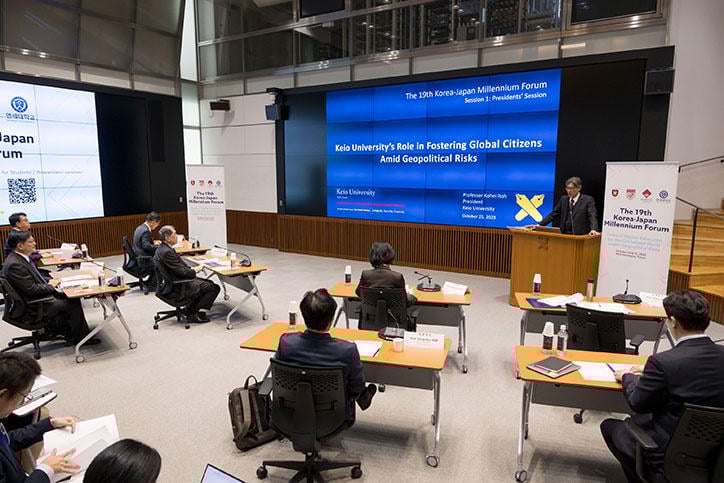 学長セッションは、土屋 大洋常任理事がモデレータを担い、本フォーラムのテーマである“Roles of Higher Education for the Globalized World under Geopolitical Risks(地政学リスクの下での高等教育の役割)” に沿って、各大学の学長が発表を行い、引き続いて意見交換も行われました。伊藤 公平塾長は、高等教育におけるさまざまな課題への慶應義塾大学の今日までの取り組みを紹介しながら、流動的な世界情勢の下で、グローバルな教育研究機関として義塾は今後どうあるべきかについて見解を述べました。