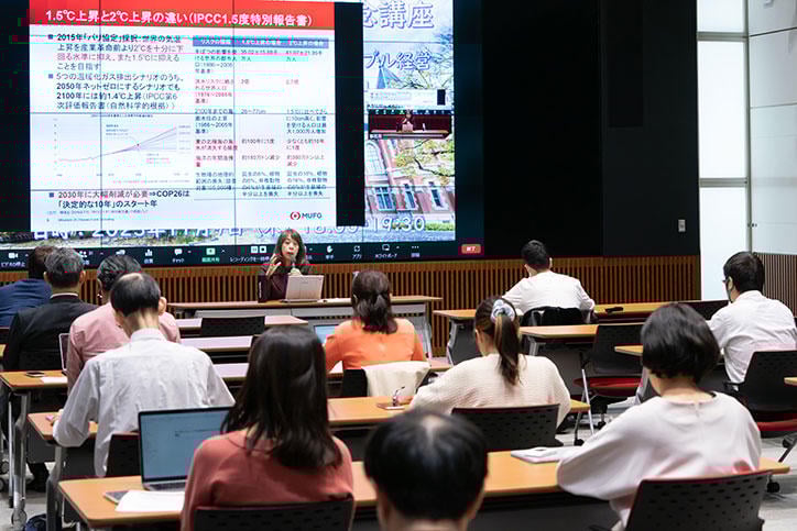 講演では、地球が抱えている気候変動や生物多様性喪失に対応する世界と日本の動向を踏まえ、高まる金融の役割について解説されました。さらに、ESG投資、サステナブルファイナンスの基礎となる企業の非財務情報開示についても触れ、企業に求められるサステナブル経営のあり方について説明がありました。