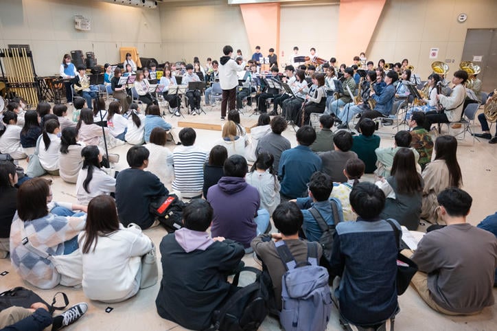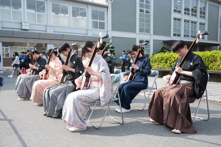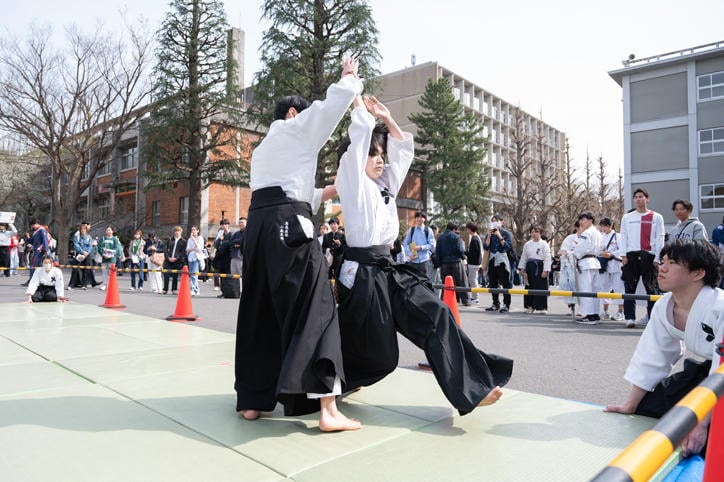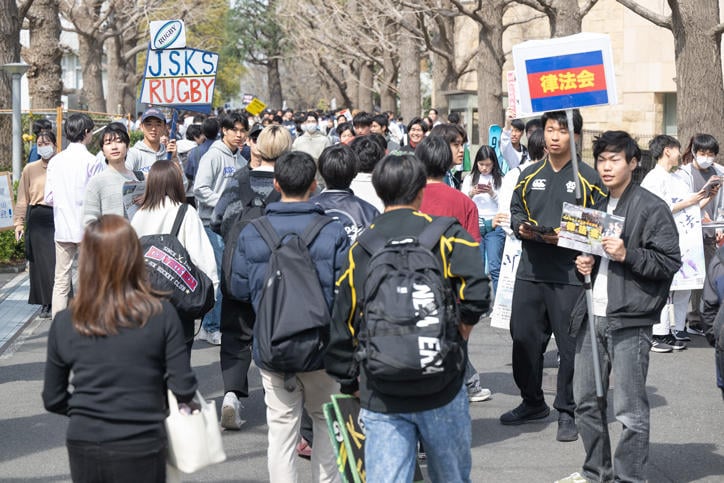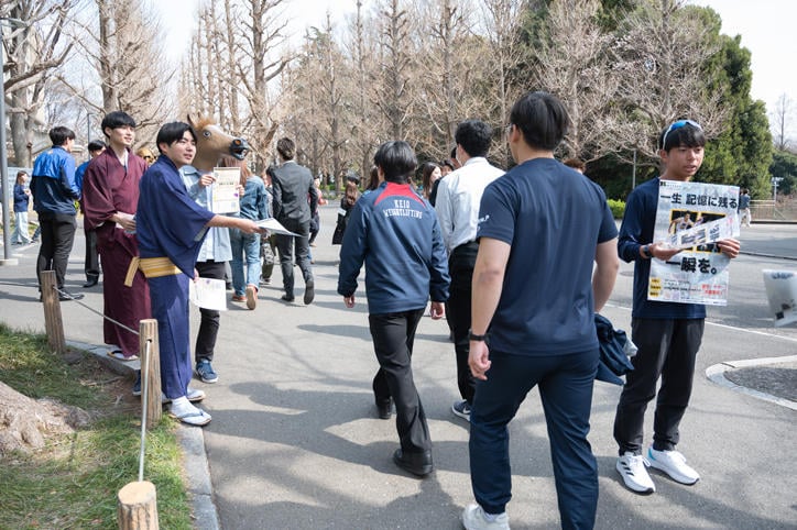 オリエンテーション期間の日吉キャンパスでは、さまざまな学生団体による新入生の勧誘やステージイベントが行われています。桜が咲き始めた日吉キャンパスは、多くの新入生らで賑わいをみせ、活気に満ちています。(撮影日:2024年4月2日)