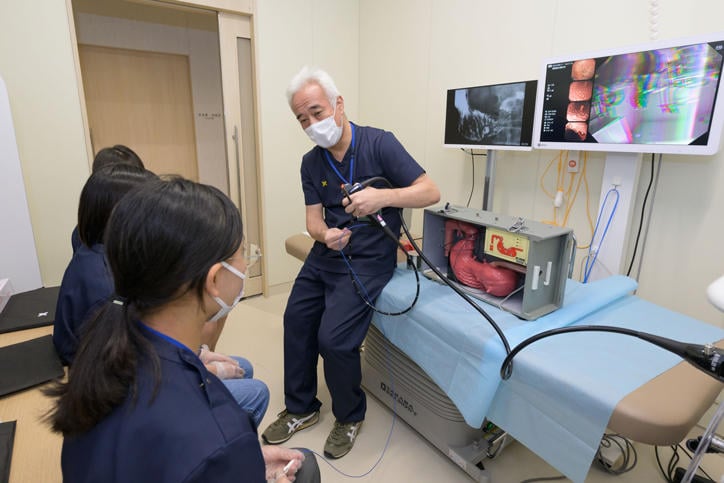 参加した中学生たちは3グループに分かれ、予防医療センターの医師・看護師・技師と、医学部・看護医療学部・薬学部生の救命救急措置法普及活動サークル「KAPPA (Keio ACLS Popularizing and Promoting Association)」所属学生の指導で、内視鏡で胃の中を調べるトレーニング、腹部超音波検査装置による内蔵の様子の観察、シミュレーターとAEDを使った一次救命処置の3つを、ローテーションしながら学んでいきました。