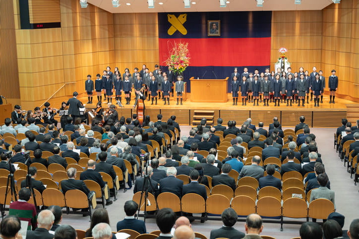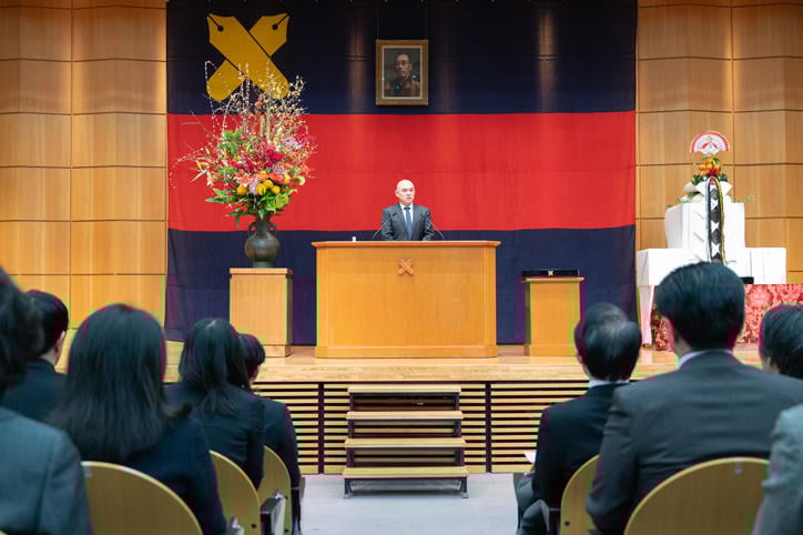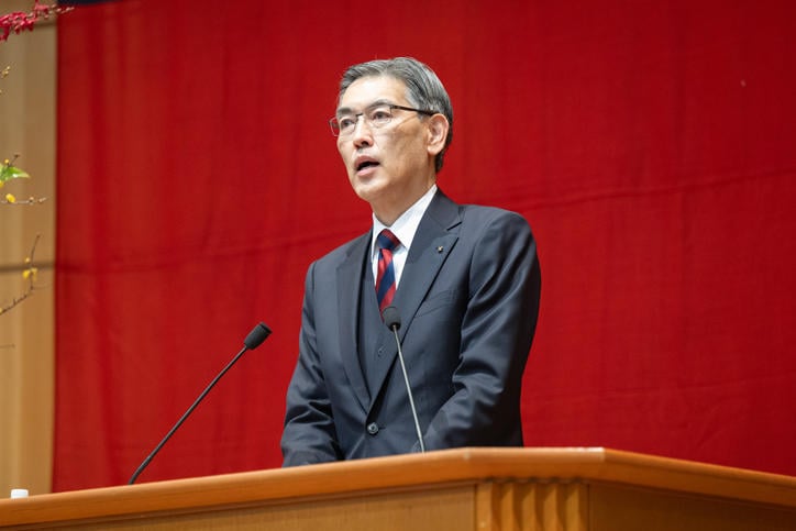 式典は、幼稚舎生と横浜初等部生による「福澤諭吉ここに在り」合唱、ワグネル・ソサィエティー男声合唱団による「日本の誇」合唱から始まり、続けて伊藤公平塾長による年頭挨拶が述べられました。年頭挨拶で伊藤塾長は、福澤諭吉が激動の時代に日本社会が正しい方向に向かうよう、批判を覚悟の上でその時に最も相応しいと思うことを、信念をもって発信し続けたことを例にあげながら、慶應義塾が力を合わせて日本の高等教育を変革していく力強い決意を示しました。