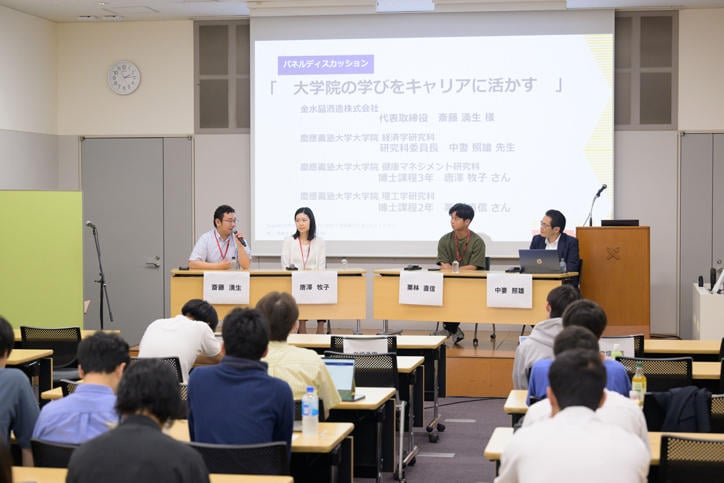 当日は、慶應義塾大学の博士課程学生に加えて、修士課程学生・学部生が100名以上集まり、博士課程修了後の自身のキャリアの可能性について広く考える機会となりました。