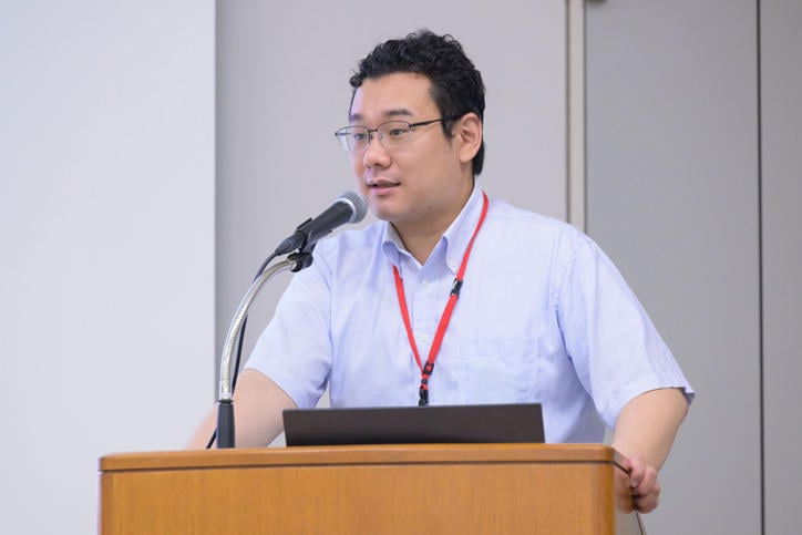 シンポジウムスペースで行われた冒頭の基調講演では、金水晶酒造株式会社代表取締役の斎藤湧生氏が登壇しました。酒造経営の傍ら本学で博士号を授与されたご経験から「研究とビジネスの融合-産学官連携による市場創出-」をテーマにお話しいただきました。