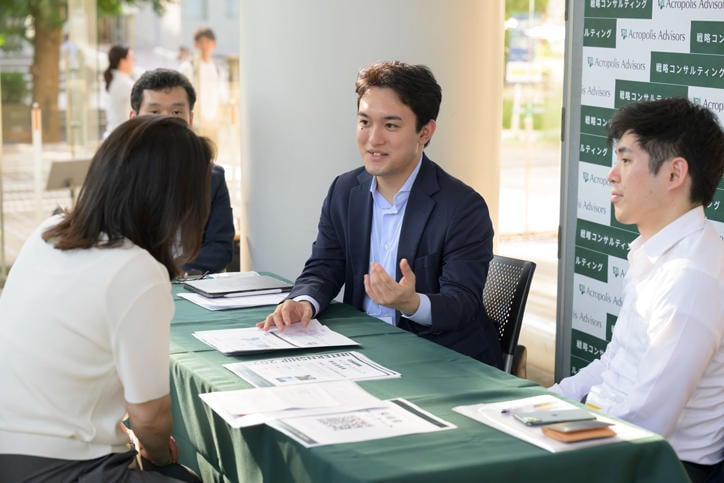 また、上記の企画と並行して、イベントテラスにて行われた企業ブースでは、企業の担当者と参加学生とのキャリアに関する相談会が行われました。参加者たちは14社の出展企業のブースを回り、企業の担当者たちに積極的に質問する様子が見受けられました。