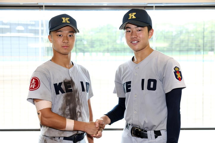 試合後の両チーム主将へのインタビューでは、守備時も慶應の応援曲が流れることについて「守備でも自分たちのチームを応援してくれていると思って臨んだ。新鮮で楽しかった」と声を揃えました。応援について、SFC高等部の花井主将は「塾高に比べて人数が少なかったと思うが、自分は全然そうは感じなかった。応援の声はしっかり届いていた」とし、「普段一緒に授業を受けている友達がたくさん来てくれたので、名前を呼んでくれると響くというか、本当に心のこもった応援をしてくれて嬉しかった」と感謝の気持ちを語りました。塾高の山田主将は「試合に集中すると応援が聞こえないこともあるが、今日はしっかり聞こえて本当に力をもらえた。こんなに応援してくれる人がいるんだ、自分も応援してくれる人たちのために全力でやるぞ、と『他喜力』がわいてくるのを感じた」と語りました。最後には花井主将から山田主将へ、「“慶應”を背負って一番上までいってほしい」とエールが送られました。