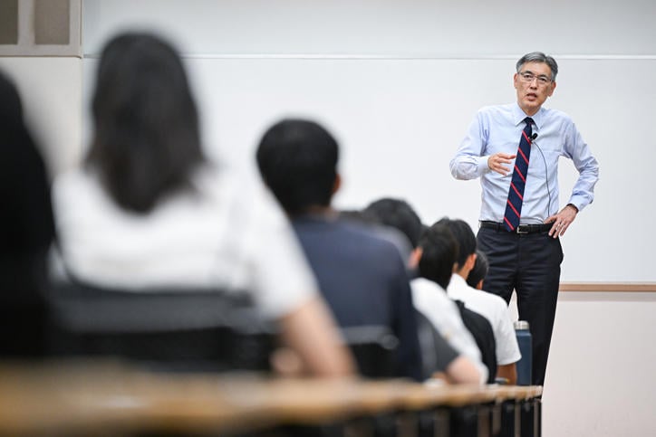 前半の講演では、ハーバード大学をめぐる現状を踏まえつつ、慶應義塾が困難に直面した史実を例に、「歴史」から自らがとるべきスタンスを読み解くことが判断の礎となる、と説明がありました。また、福澤諭吉著『民情一新』にも触れ、若い世代こそ、時間をかけて貪欲に知識を吸収し、情報におぼれずにさまざまな考え方を身につけてほしいと語り、「目的達成の道のりに、最短距離はない」と参加者に力強く語りかけました。