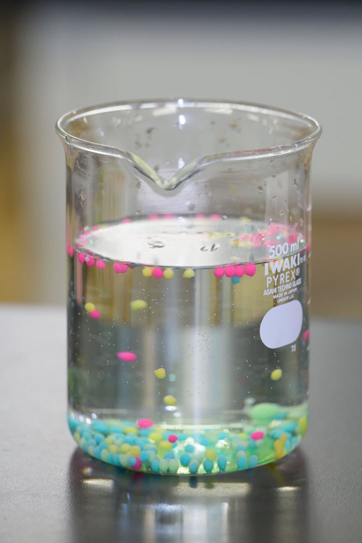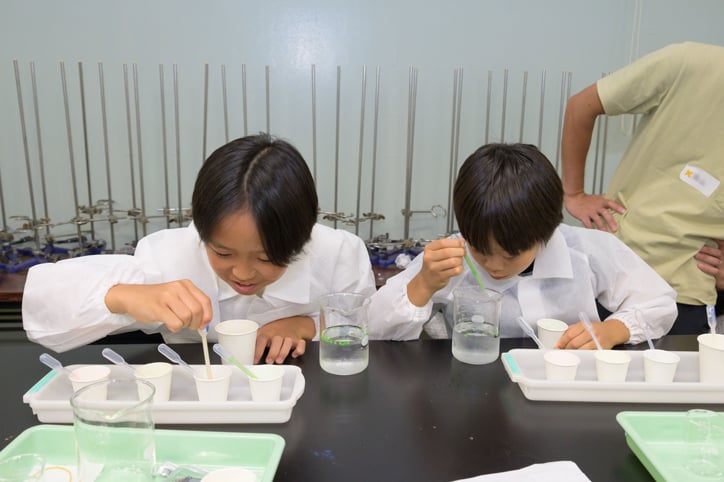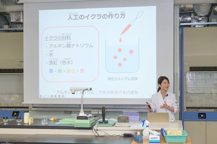 今回は、小学3年生以上を対象に、前半は微生物の呼吸についての講義を行い、後半には実験を通じて理解を深める構成で実施しました。実験では、海藻のネバネバ成分であるアルギン酸ナトリウムなどを用いて人工の「イクラ」を作製し、その中に酵母菌を封入して水中でのアルコール発酵を観察しました。酵母菌が呼吸を行うことで、人工のイクラが水中に浮かび上がる様子を観察することで、目に見えない微生物も私たちと同じように「食べて、息をして、生きている」ことを、実感できたのではないでしょうか。