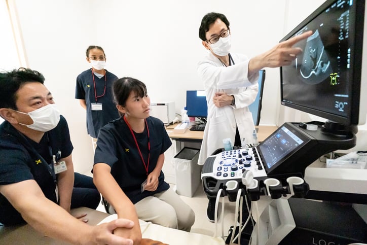 参加者は3つのグループに分かれ、予防医療センターの医療スタッフ用ユニフォームを着用して、医師・看護師・技師と、医学部・看護医療学部・薬学部生の救命救急措置法普及活動サークル「KAPPA (Keio ACLS Popularizing and Promoting Association)」所属学生の指導で、内視鏡検査、超音波検査、一次救命処置の3種類を、ローテーションしながら体験していきました。内視鏡検査では医師のトレーニング用臓器モデルを用いて食道から十二指腸までのスコープでの観察技術、超音波検査では上腹部の臓器を模したシミュレーターで内蔵の様子を見分ける方法、一次救命処置では正しい胸骨圧迫の技術とAED(自動体外式除細動器)の使い方を学びました。ワークショップ開始前の説明を聞いているときは緊張した面持ちだった参加者たちも、セッションが進むにつれて医師や医学生と打ち解けた様子で談笑したり、熱心に質問したりして、とても楽しそうに学びを深めていました。