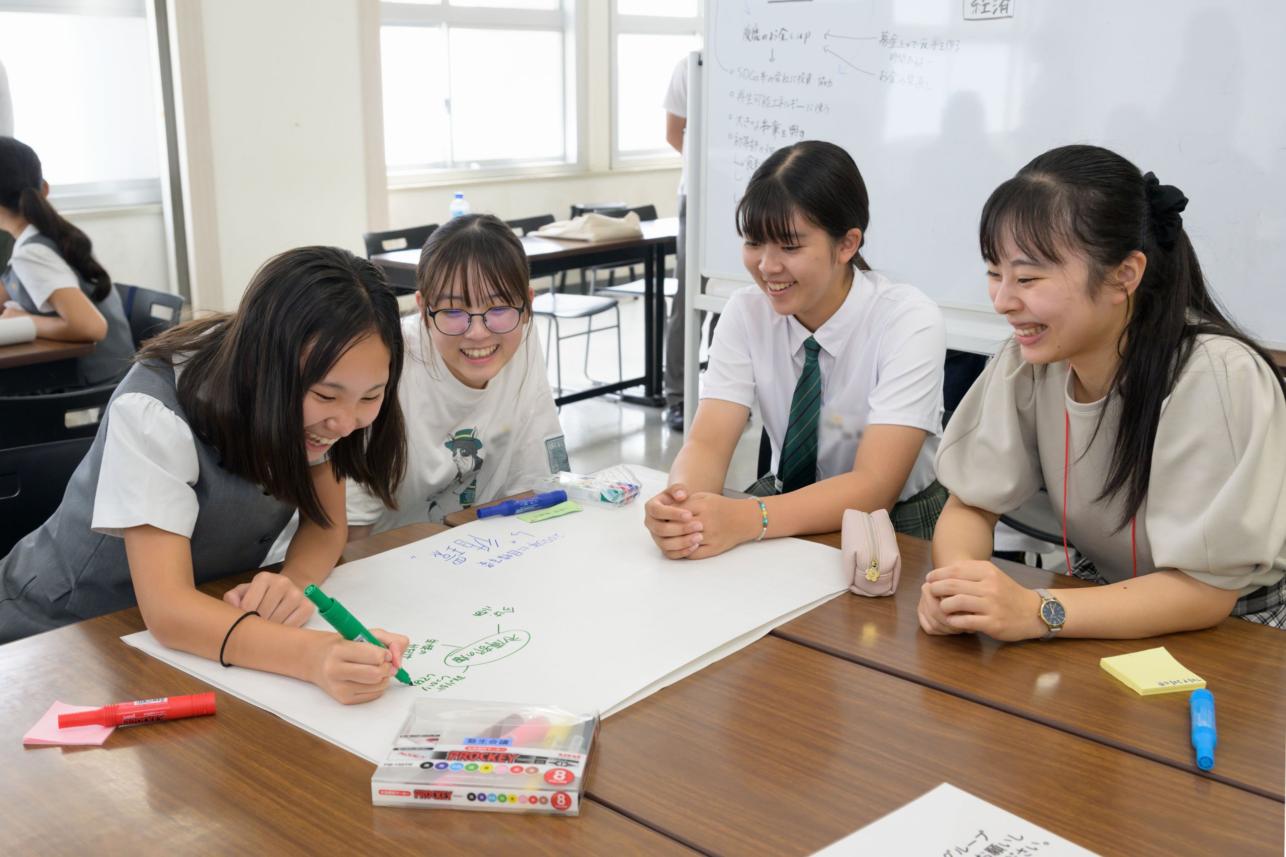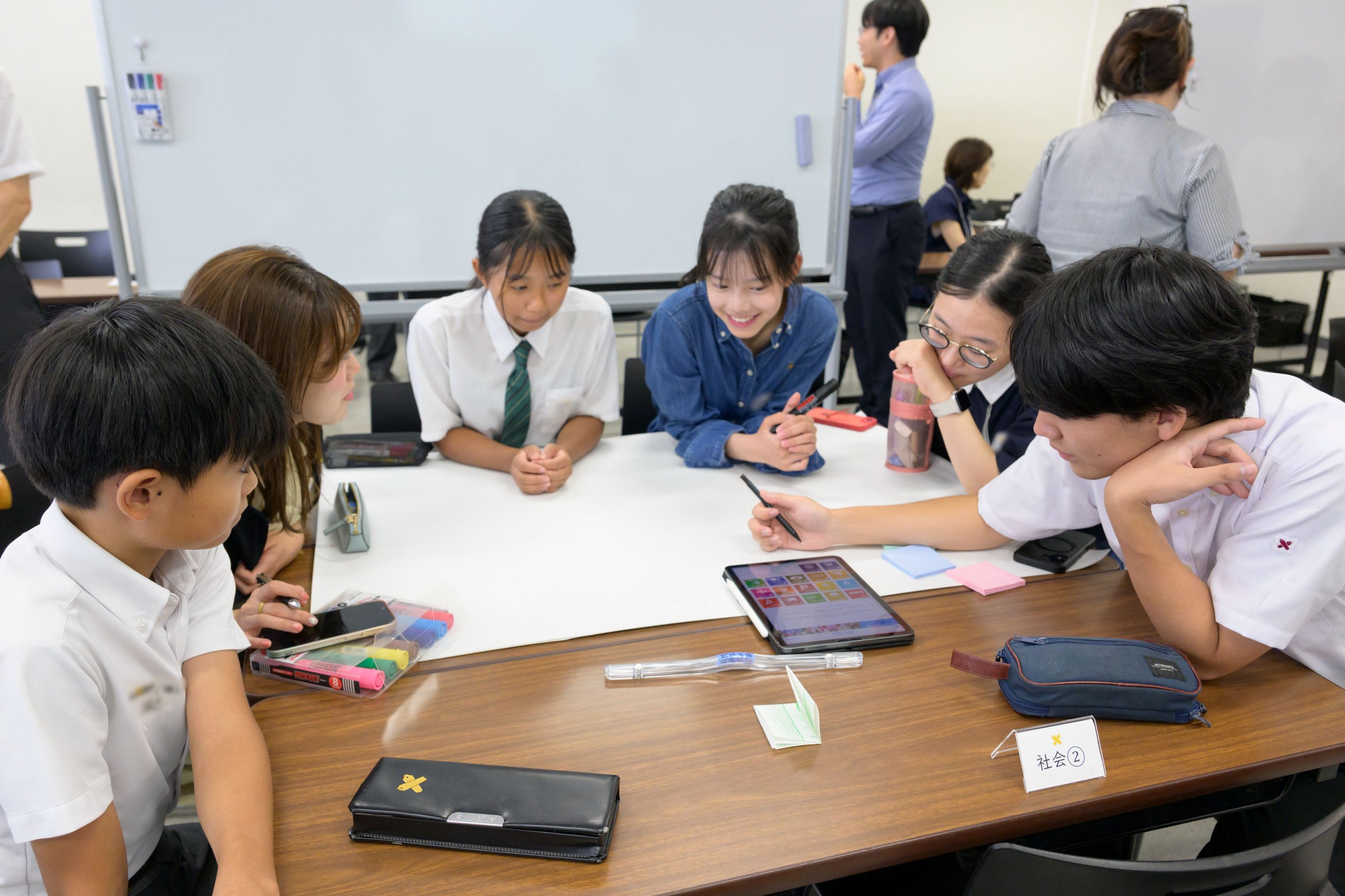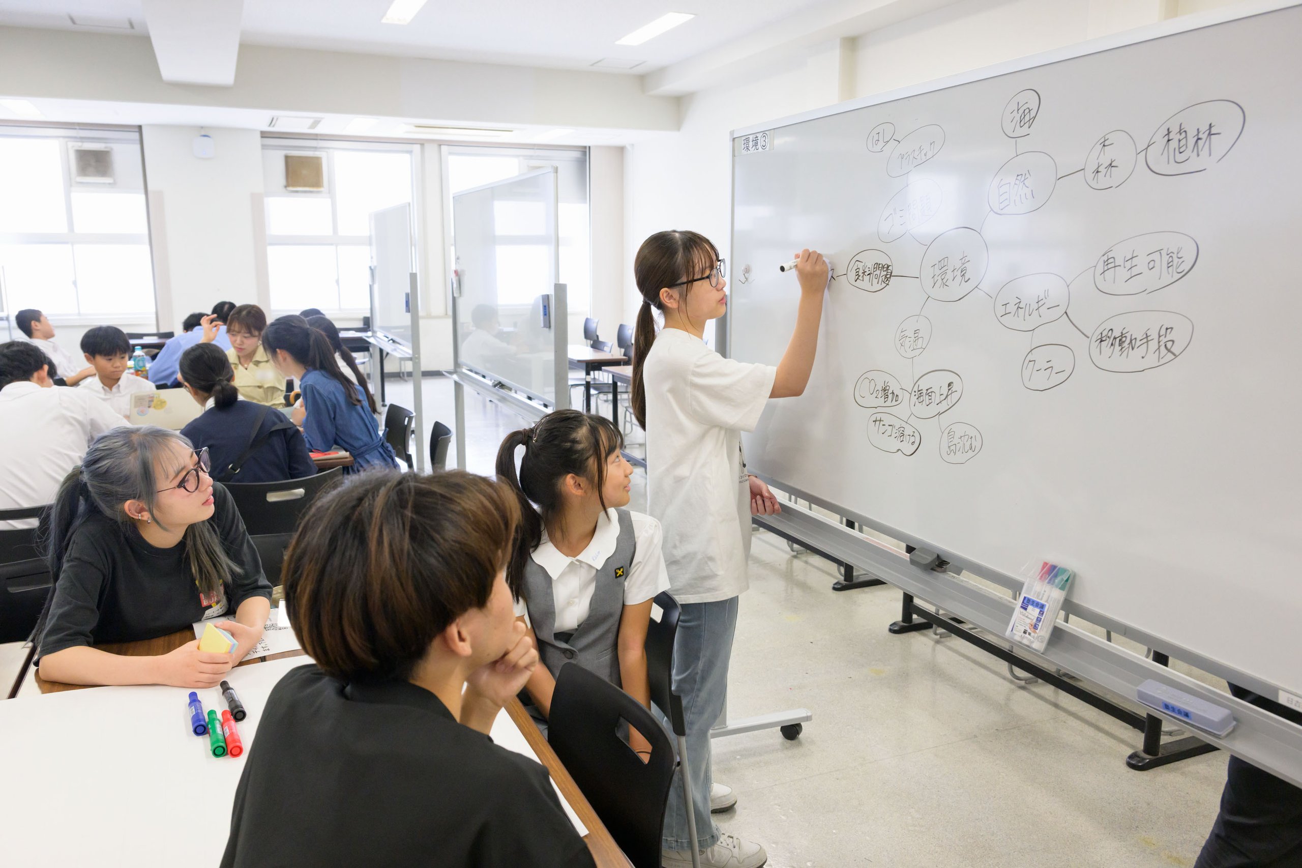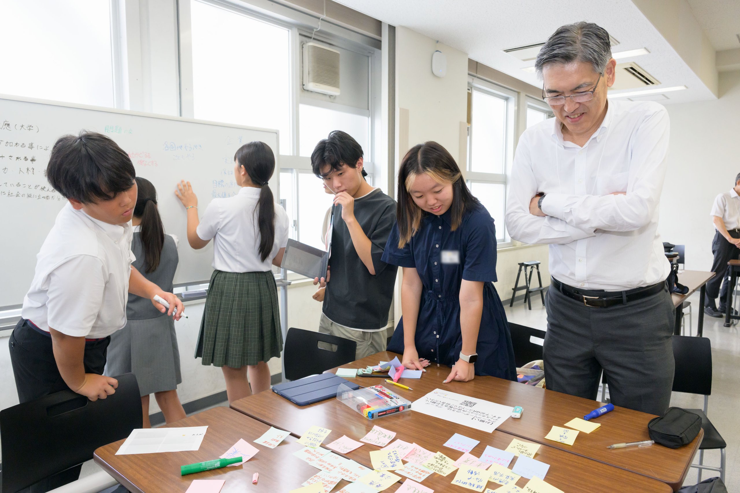 1ラウンド目のディスカッションでは、「慶應義塾が2050年に目指すべき姿」をテーマに、「環境」「社会」「経済」「パートナーシップ」の4つのグループに分かれて議論しました。昼食を挟んで午後には、2ラウンド目のディスカッションを実施し、午前中に挙げた「目指すべき姿」に対して、「学校や慶應義塾がそれを実現するためのアクション」について検討しました。参加者が熱のこもった議論をしているあいだ、各一貫教育校の教員も別の教室に集まり、塾生会議プロジェクト代表を務める小林宏充法学部教授の司会のもと、各校でのSDGsの取り組みや今後の連携について協議しました。