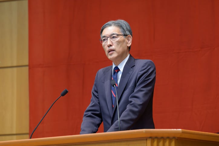 式は、松浦良充常任理事の学事報告に始まり、続いて伊藤公平塾長が英語で式辞を述べました。慶應義塾の目的や福澤諭吉の青年時代について触れたうえで現代の様々な技術・知見を駆使しても学ぶことには時間がかかるため、これからの大学/大学院生活のなかでじっくり学び、研究に注力し、学友と関わり、そして世界に羽ばたく人材となってほしいと伝えました。