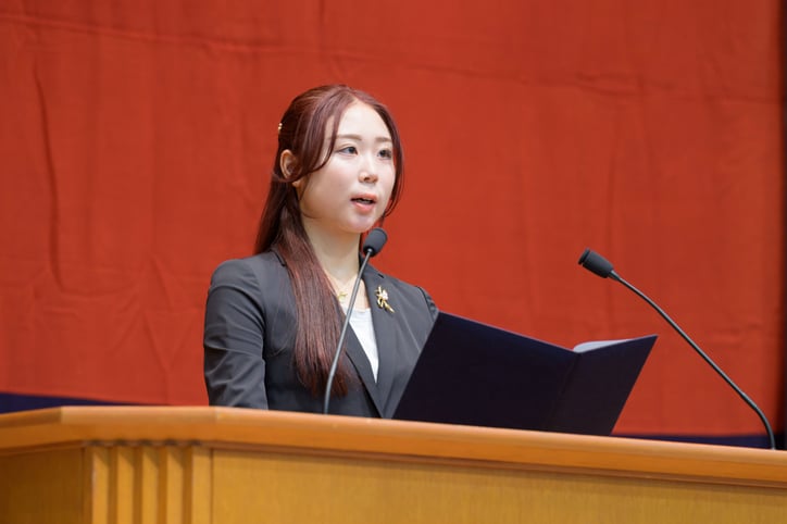 続いて、教職員代表として滑川徹理工学研究科教授による祝辞の後、新入生を代表して環境情報学部の宮崎仁美君が入学の辞を述べました。最後に学生団体楽友会とともに参列者全員で塾歌を斉唱し、式典は終了しました。