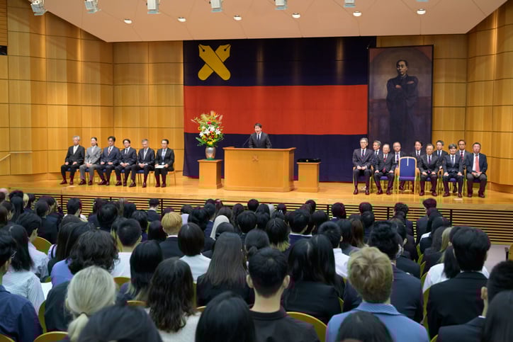 9月22日(月)10時より、三田キャンパス西校舎ホールにて、2025年度の9月入学式が学部、大学院合同で挙行されました。今年度の9月入学者数は、学部および別科・日本語研修課程合計352名(経済学部137名、法学部7名、総合政策学部56名、環境情報学部42名、別科・日本語研修課程110名)、大学院合計320名(修士課程222名、博士課程75名、専門職学位課程23名)でした。