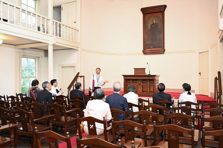 また、お披露目会終了後には、2つのグループに分かれてキャンパスツアーを実施しました。久しぶりにキャンパスに足を運ばれた方も多く、普段は立ち入ることのできない演説館などを見学しました。