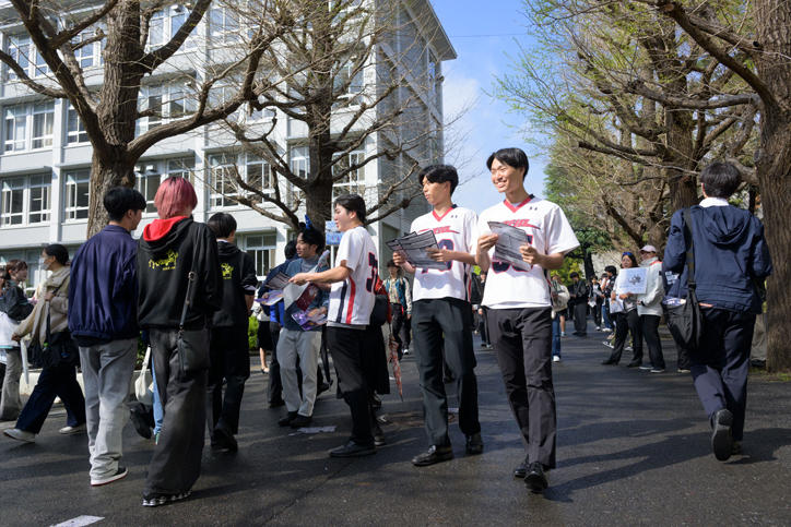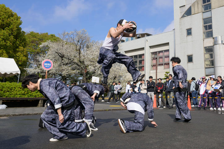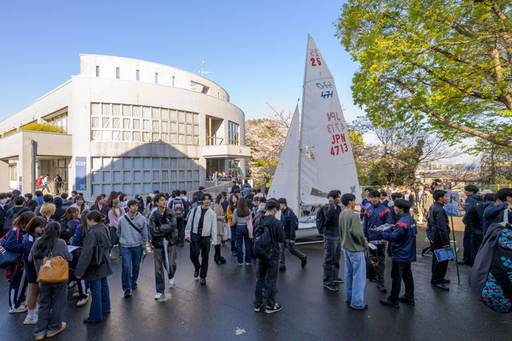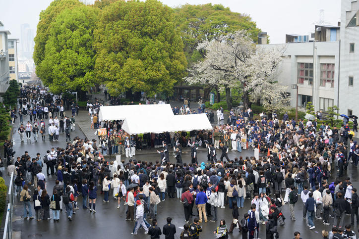 オリエンテーション期間の日吉キャンパスでは、さまざまな学生団体による新入生の勧誘やステージイベントが行われています。午前中は春の雨に見舞われましたが、午後には雨も上がり、キャンパスは活気を取り戻しました。期待に胸を膨らませる新入生と歓迎する上級生たちの熱気で、キャンパス内は一際賑わいを見せています。(撮影日:2026年4月2日)