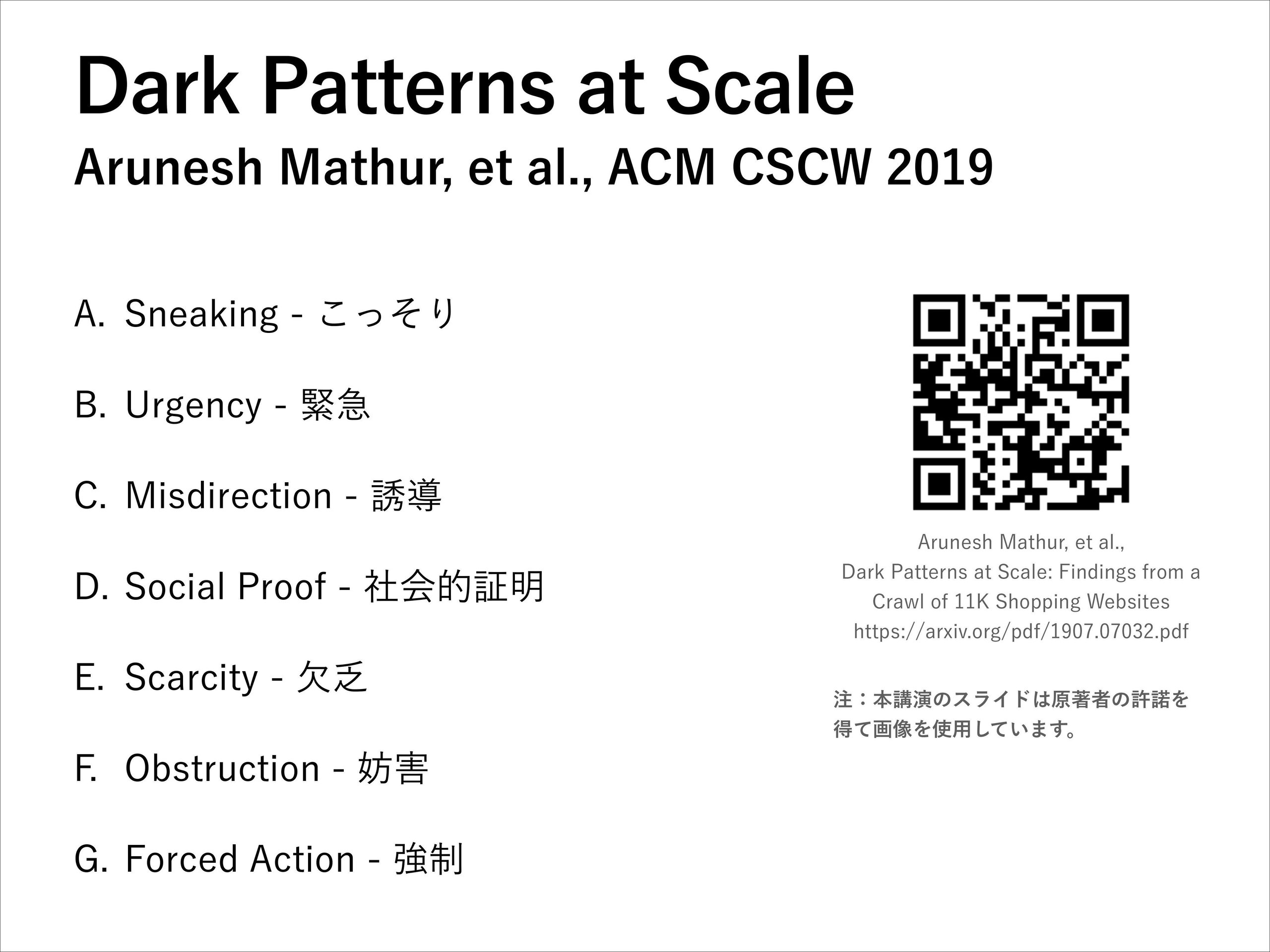 コンピューターサイエンス系の学会ACM(Association for Computing Machinery)で発表されたアルネシュ・マーサー(Arunesh Mathur)氏らによる論文「Dark Pattern at Scale: Finding from a Crawl of 11K Shopping Websites」(2019年)では、世界中のECサイト1万件のうち約10%に何らかのダークパターンが発見されており、それを以下の7種類に類型化しています。