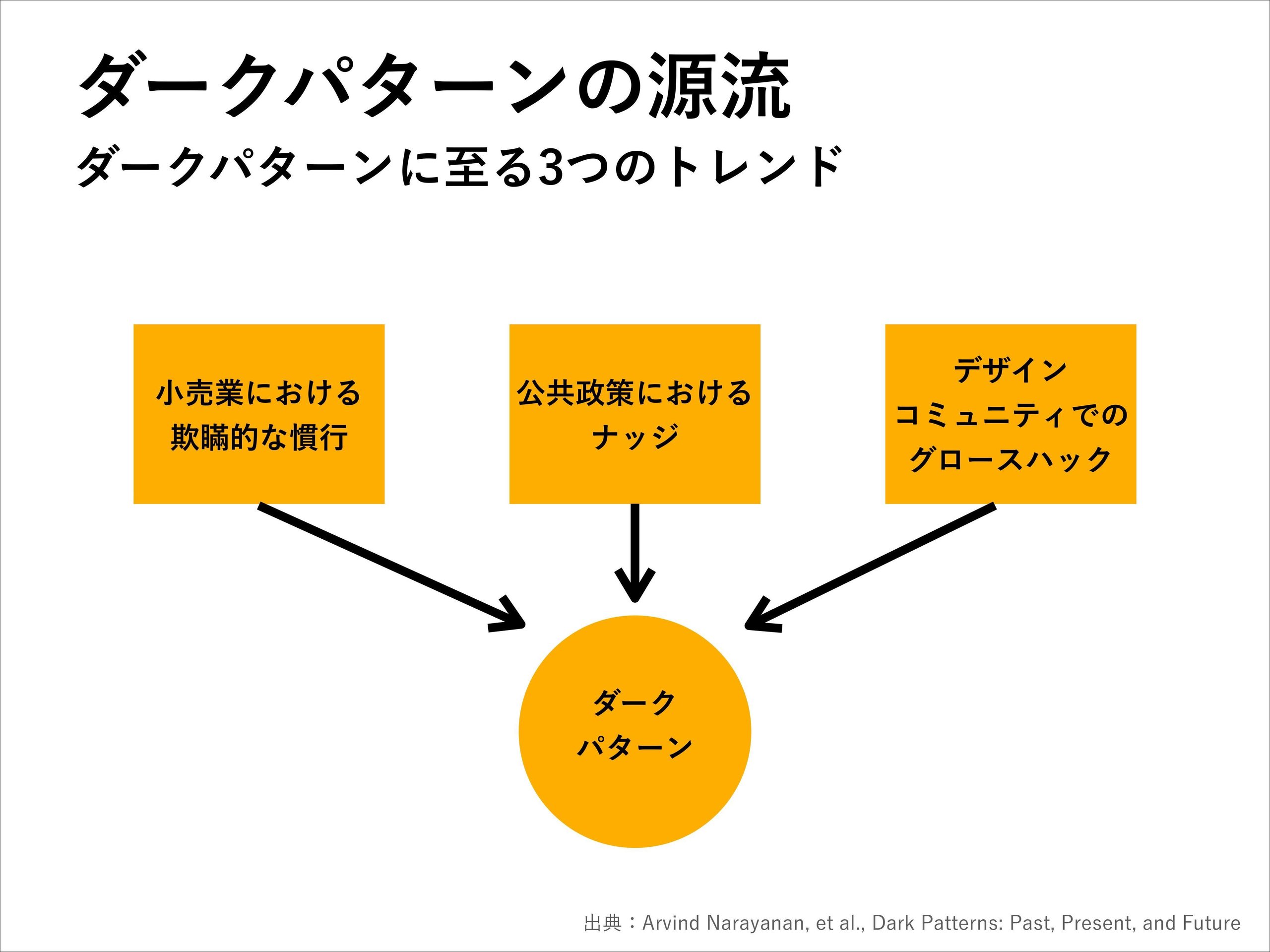 次に、ダークパターンはどのように生まれ、成長を遂げてきたのか。先ほどの論文から、以下3つの流れを紹介します。