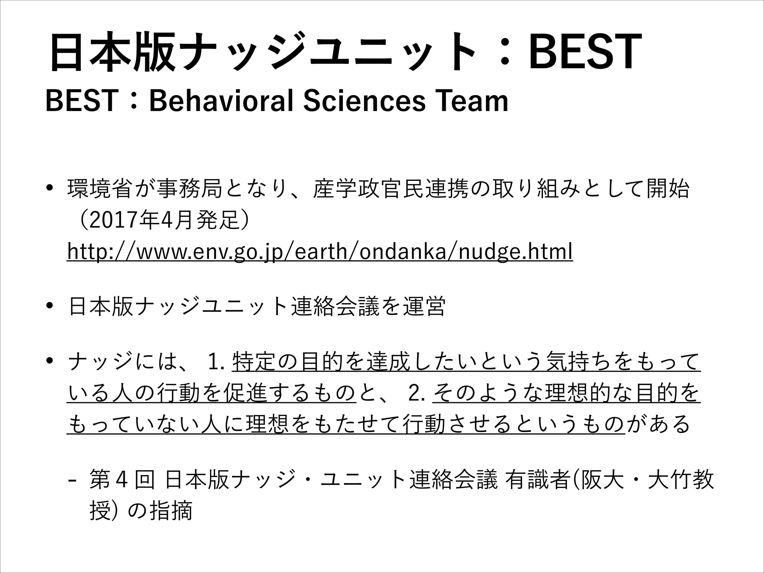 各国で導入が進められるなか、日本では2017年に環境省が事務局となり「日本版ナッジ・ユニットBEST」が結成されました。上はその公開資料からの引用ですが、公共の目的とはいえ、人々自身が意図していない行動変容を促すことを良しとするのか、議論が必要だと思います。