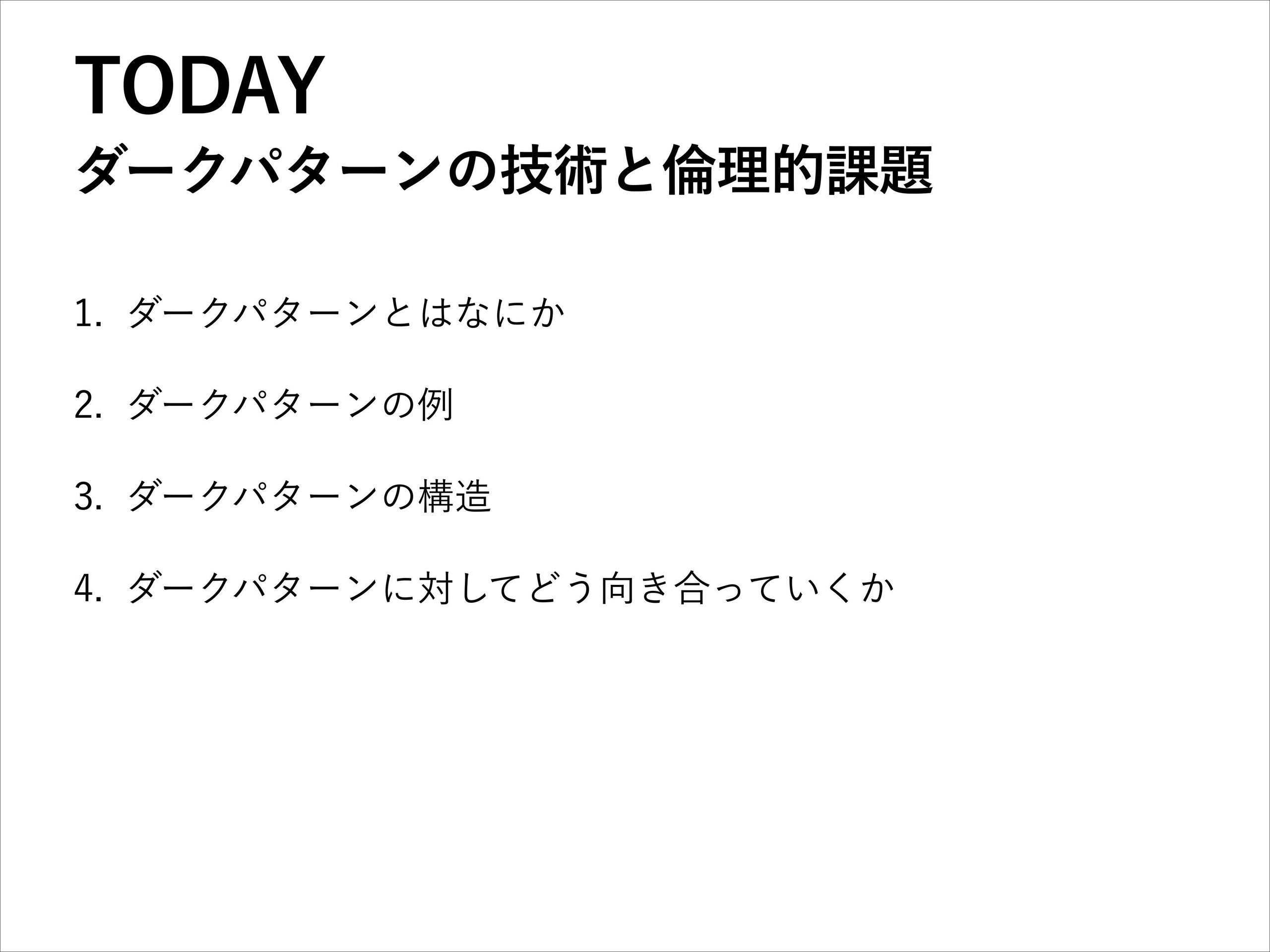 本日はダークパターンについて、以下4つのパートに分けて説明していきたいと思います。