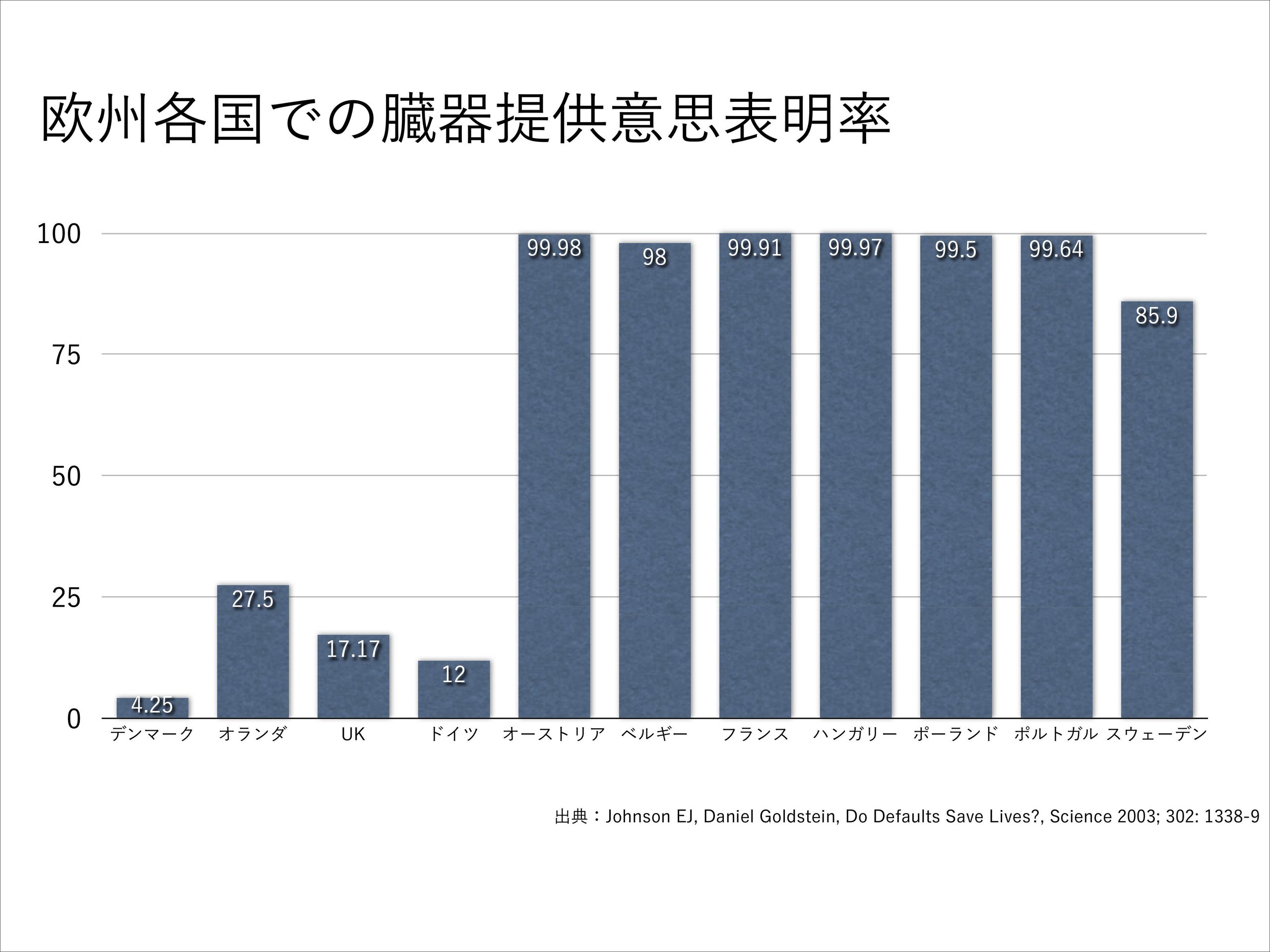 有名な事例としては、欧州における臓器提供の意思表明率があります。「臓器提供するならチェックしてください」という記入方法を採用しているイギリスやドイツが十数%なのに対して、「拒否するならチェックしてください」としたフランスやオーストリアは表明率が100%近くに達しています。後者の方が公共の利益に適っていますが、これだけ重大な事柄を大半の人が自覚せず表明している状態が議論を呼んでいます。