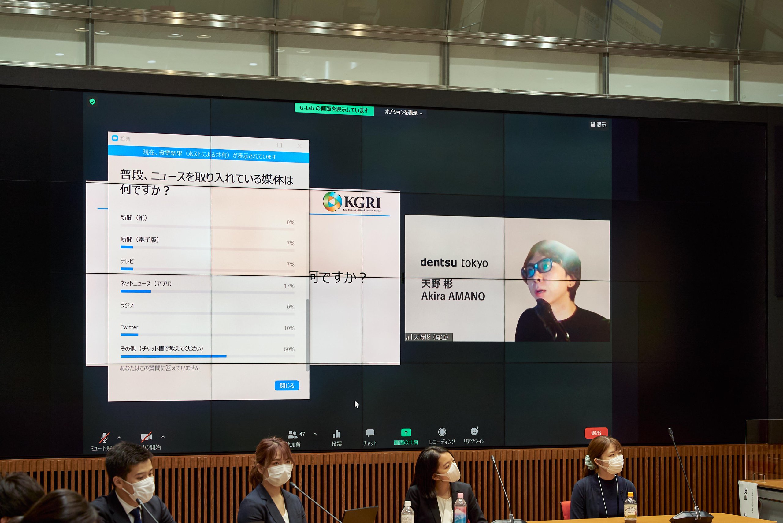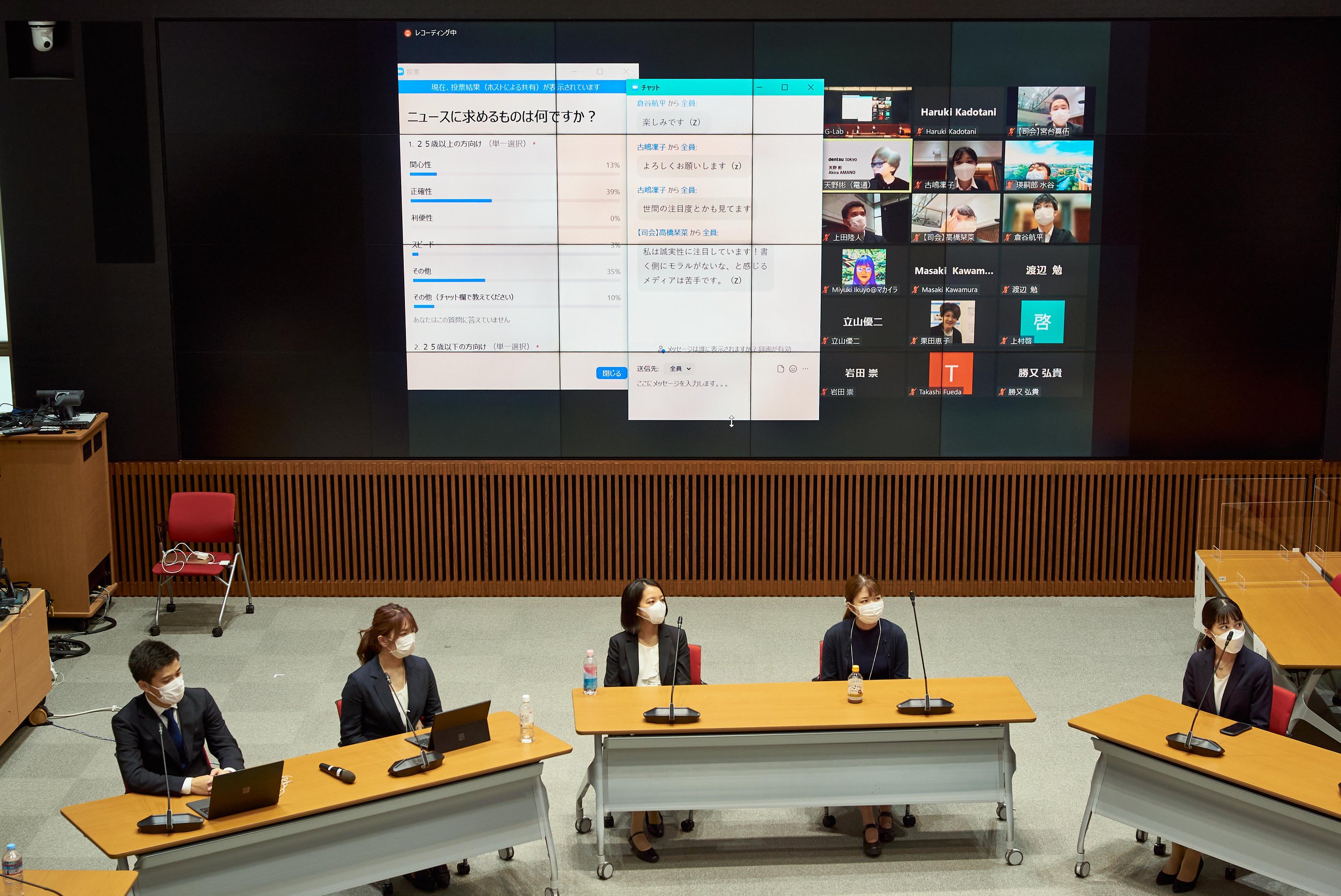 シンポジウムは新型コロナウイルスの感染拡大を受け、オンラインを交えたハイブリッド形式で実施。新聞、ウェブメディア、プラットフォーマー関係者、研究者らによる発表と、ゲストに吉本興業所属タレントの田村淳らを迎えたパネルディスカッションが行われた。その後、シンポジウムの運営にも携わった学生有志が中心となり、「Z世代の新会議 〜新聞の果たす役割を維持するために、ニュース受容のあるべき姿を考える〜」と題したアフターセッションを実施。