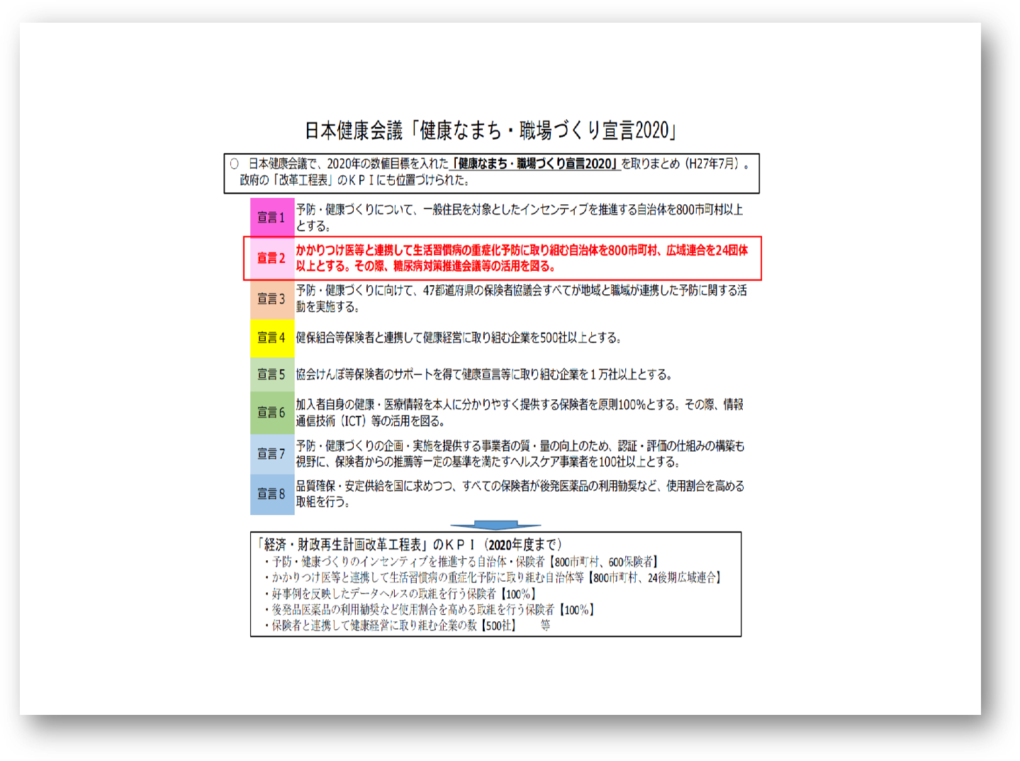 2015年には、厚生労働省と経済産業省により日本健康会議が発足しました。経済界、医療界、自治体、この3つのステークホルダーにとって、健康寿命の延伸と医療費の適正化は意見が一致するところです。そのなかで日本健康会議は、20年に8つの宣言からなる「健康なまち・職場づくり宣言2020」を採択しました。一つは生活習慣病の重症化予防に取り組む自治体を増やすこと。例えば、健診で疾病が疑われても医療機関を受診しない、通院しない、そんな方がたくさんいらっしゃいます。自治体が保有するデータから、医療機関への受診を促し、重症化する前に病気をコントロールできれば、重症化する確率を相当減らすことができ、医療費も抑えられ、医療費の適正化や健康寿命の延伸にもつながるというわけです。