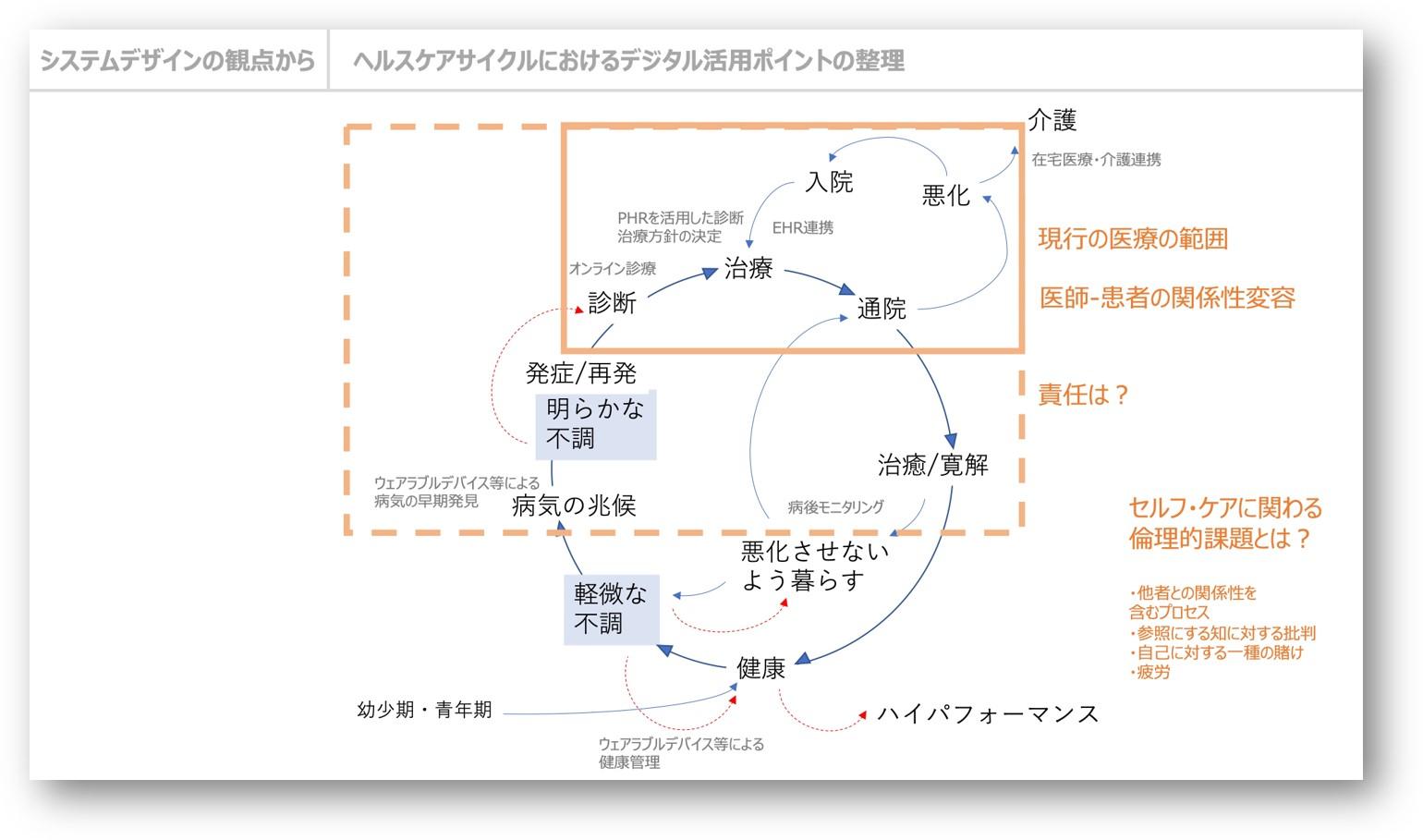 健康な状態から病気が発症し、診断、治療を経て治癒・寛解し健康な状態に戻る、もしくは悪化させずに病気と付き合っていく。これがヘルスケアのサイクルですが、デジタル化によって患者の生体情報や生活ログを活用するようになると、今まで医師任せだった治療に患者が参加可能になり、医師―患者の関係が変容する可能性があります。ウェアラブルデバイスを用いたモニタリングに関しても、医師、製薬会社、デバイス提供会社のどこに責任の所在があるのか、AIによる診断の信頼性などが問われるでしょう。