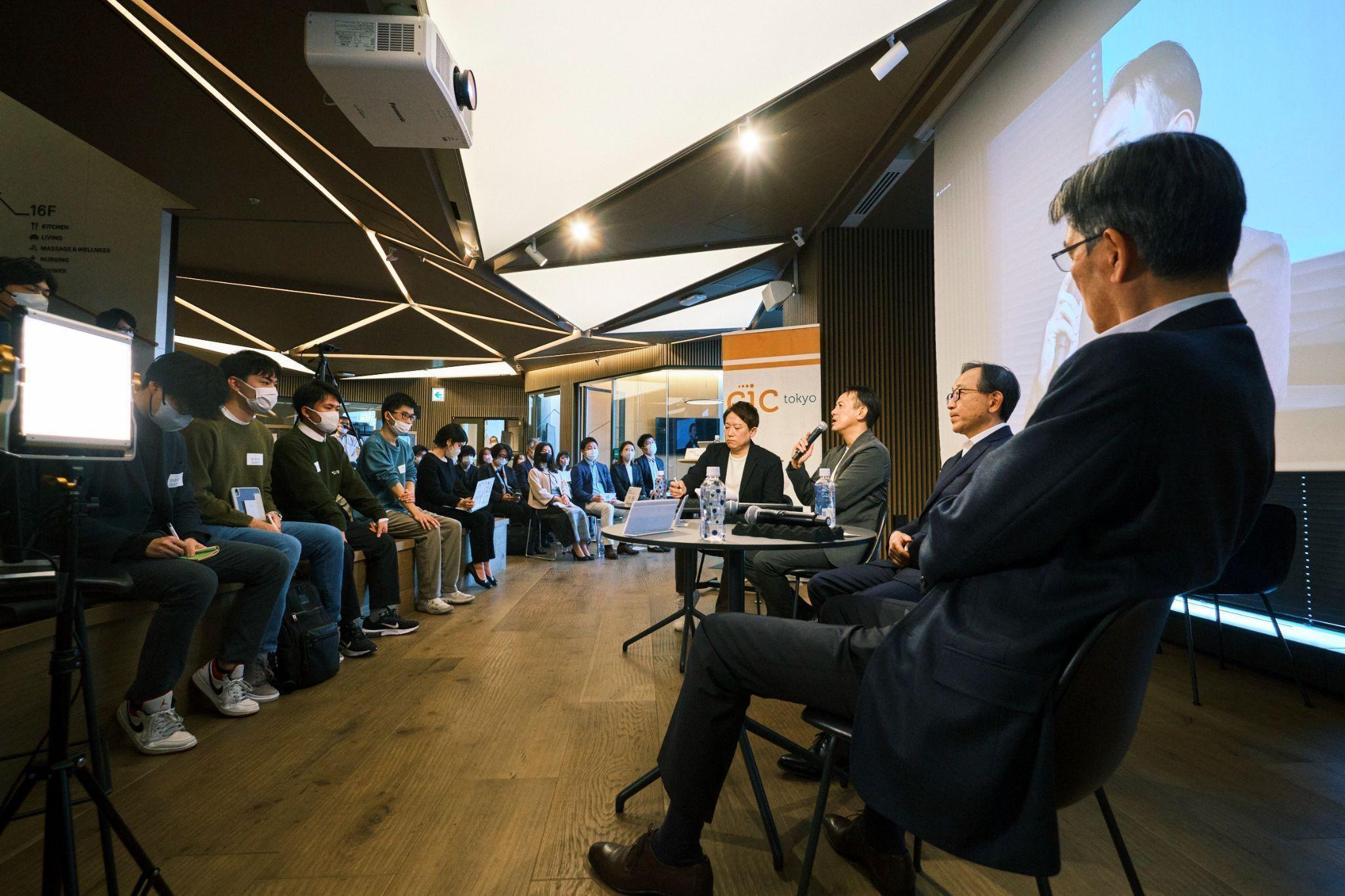 テクノロジーの発展を背景に、新たな価値観が問われるこれからの時代。不安ではなくワクワクする気持ちを持って挑戦し、未来を切り開いていくために必要なものは何か。ビジネスとアカデミアのリーディングカンパニーを率いる3名が、それぞれの「構想(ビジョン)」と「実践」を語り合い、学生たちにエールを送った。会場は、虎ノ門ヒルズに位置する東京屈指のイノベーション拠点「CIC Tokyo」。71名(うち大学生58名、一貫教育校生1名)が参加し、両社の若手社員によるパネルトークと、学生たちとの質疑応答も行われた。