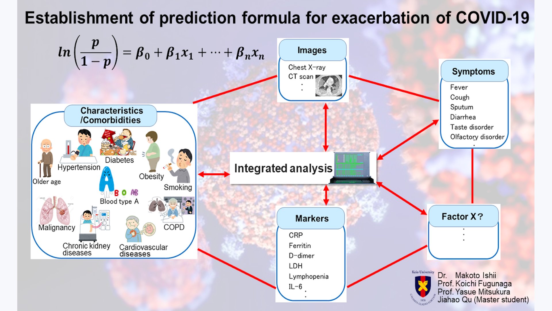 新型コロナウイルス感染症(COVID-19)は社会的脅威となっていますが、特徴として急激に増悪し重症化することがあげられます。これまで重症化の危険因子として、高齢、高血圧や糖尿病等の基礎疾患があること、各種の採血マーカー高値などが報告されていますが、本研究では、集積したCOVID-19患者さんの情報を統合解析して、医工連携にて重症化しやすさの予測式を構築して「コロナ重症化予測システム」を構築します。