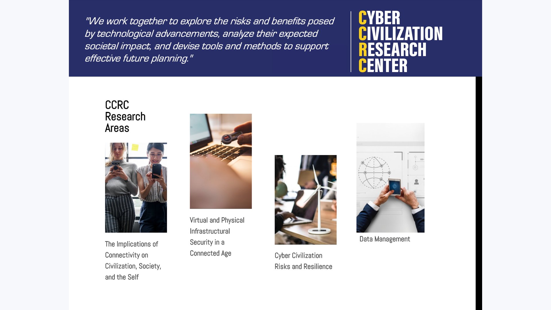 ネットワークでつながれたAI(人工知能)、IoT(モノのインターネット)、ブレイン・マシーン・インタフェース、そしてそれらが生み出すデータのクラウド集積などの今日の情報技術は、単なる便利な道具であることを超え、所有や交換、通貨制度など、今日の自由主義経済の根幹の実態を変えつつある。さらに、人間の意識や主体性、責任などといった人間の存在ありかたそのものに大きな問いを投げかけつつある。これらの大きな変化の兆候を、新しい文明の登場の黎明と捉えつつ、技術や制度形成を的確に先導をする研究を行う。